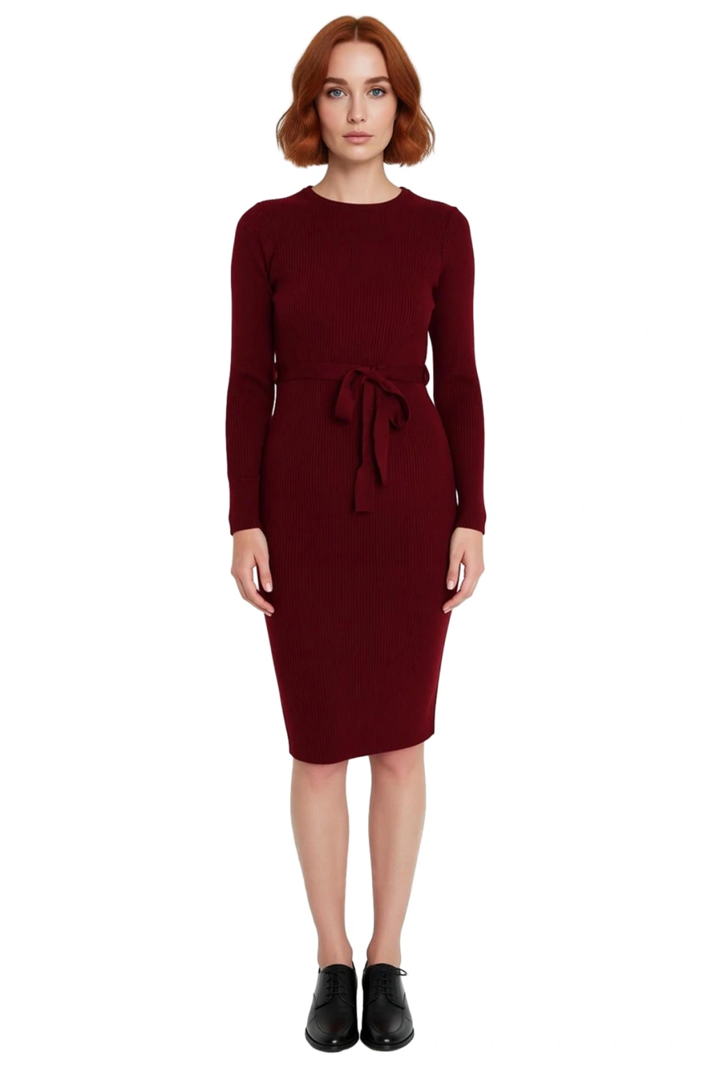 Ürün Özellikleri: Bodycon kalıp, akrilik materyal, düz desen, bisiklet yaka, standart kol, triko kumaş, bordo renk, kuşaklı kapama.