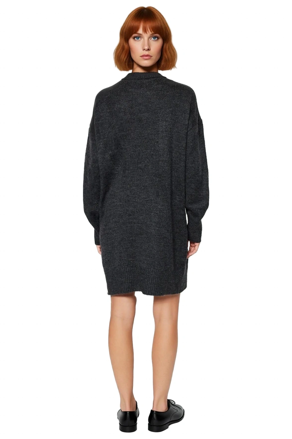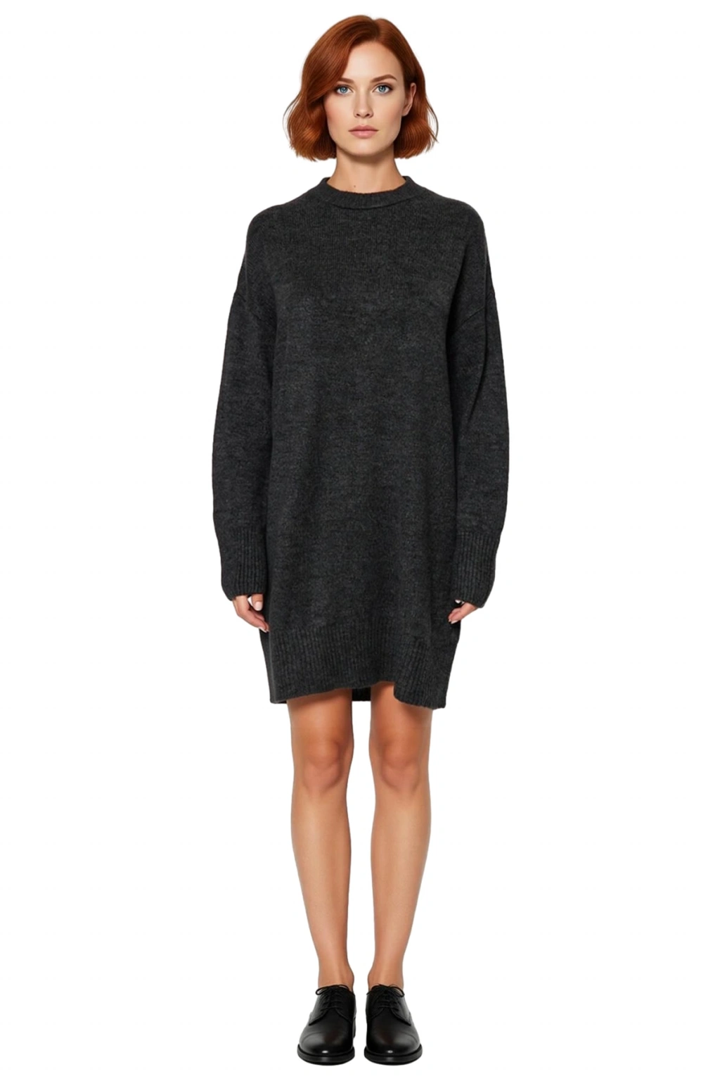Ürün Özellikleri: Shift kalıp, triko materyal, düz desen, bisiklet yaka, düşük kol, triko kumaş, gri renk.