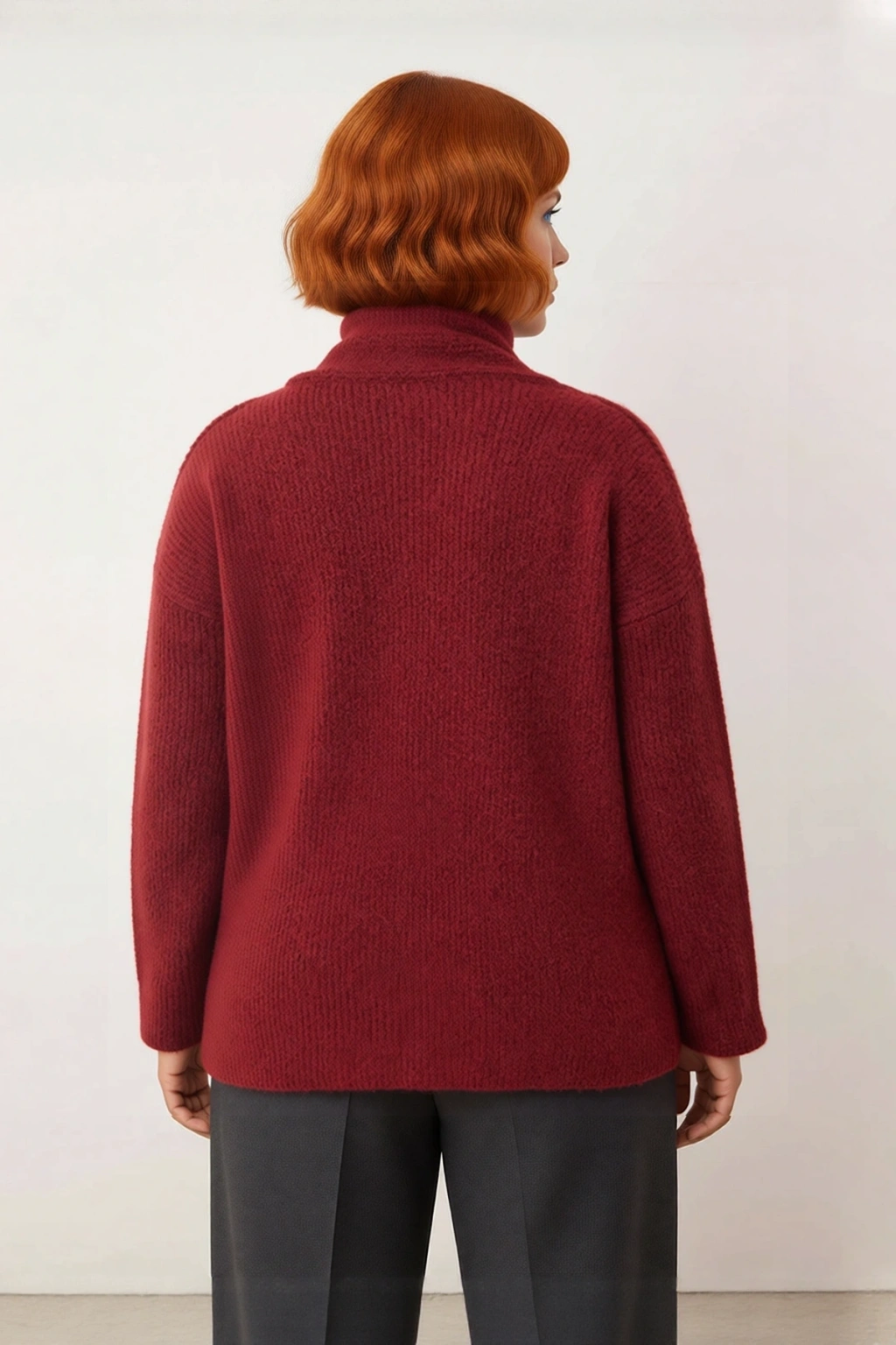 Ürün Özellikleri: Regular kalıp, yün içerikli materyal, düz desen, şal detaylı yaka, standart uzun kol, triko kumaş, bordo renk.