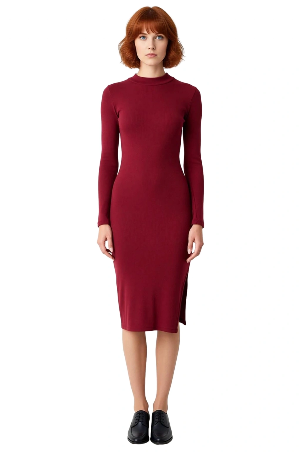 Ürün Özellikleri: Bodycon kalıp, polyester/pamuk/elastan materyal, düz desen, dik yaka, standart kol, rejenere kaşkorse kumaş, bordo renk, yırtmaçlı tasarım.