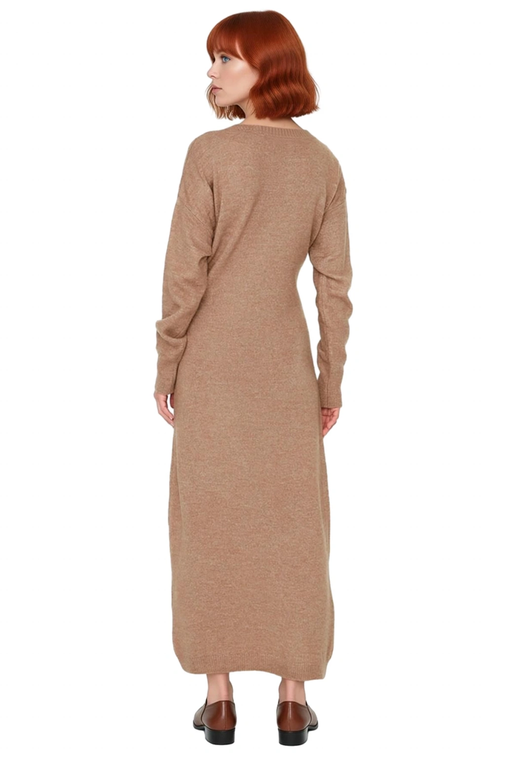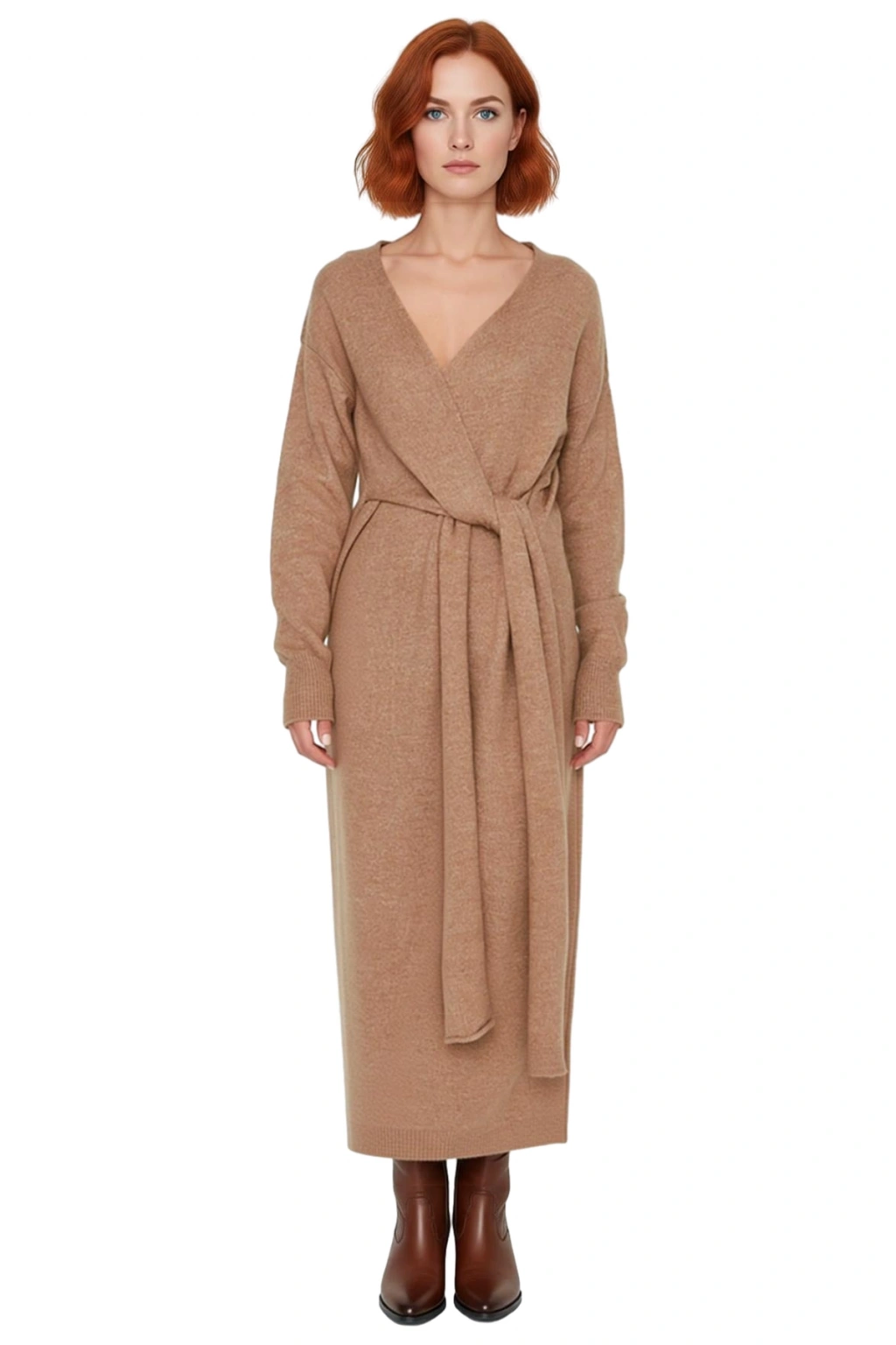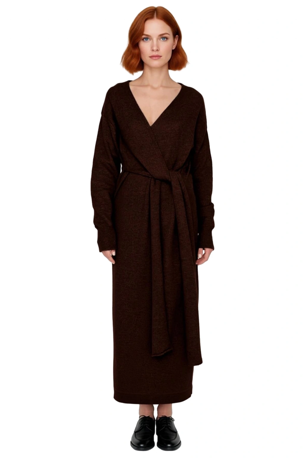 Ürün Özellikleri: Kruvaze kesim, %74 akrilik %26 polyester materyal, düz desen, kruvaze yaka, düşük kol, triko kumaş, kahverengi renk.