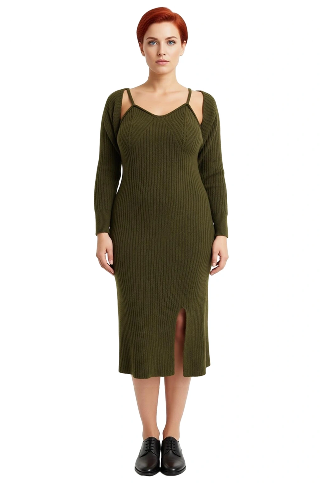 Ürün Özellikleri: Bodycon kalıp, akrilik polyester materyal, düz desen, kalp yaka, düşük uzun kol, fitilli triko kumaş, haki renk, astarsız tasarım.