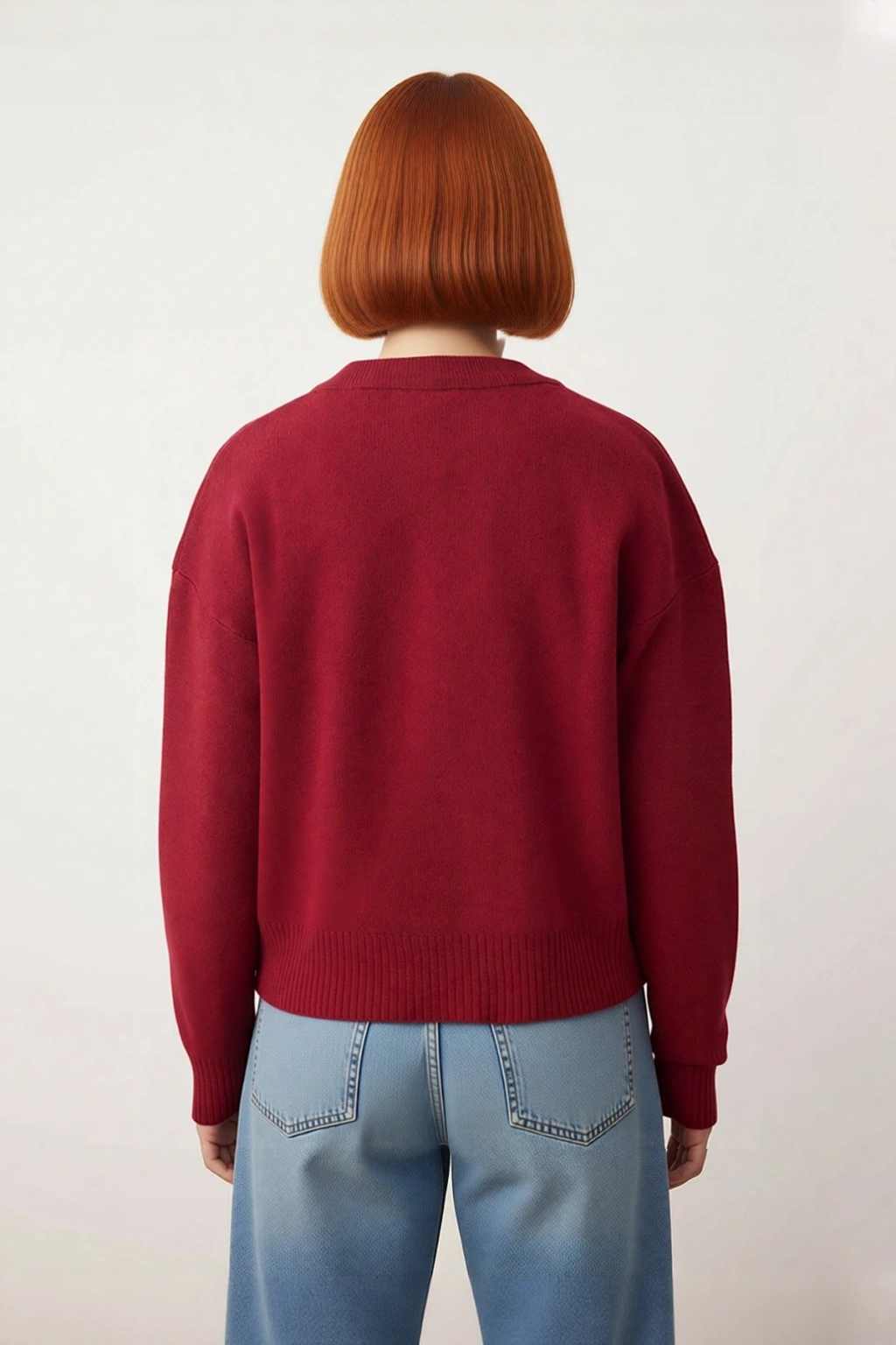 Ürün Özellikleri: Oversize kalıp, akrilik/polyester/viskoz materyal, düz desen, bisiklet yaka, düşük uzun kol, triko kumaş, koyu kırmızı renk.