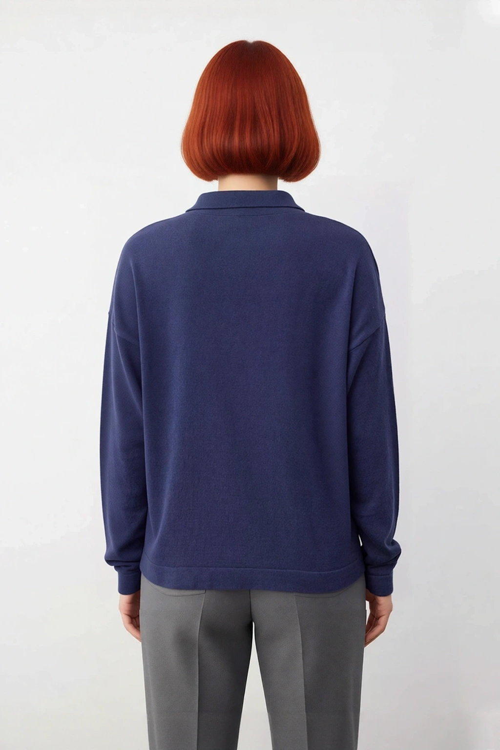 Ürün Özellikleri: Oversize kalıp, 51% akrilik 49% pamuk materyal, düz desen, polo yaka, düşük kol, triko kumaş, orta kalınlık, regular boy, lacivert renk.