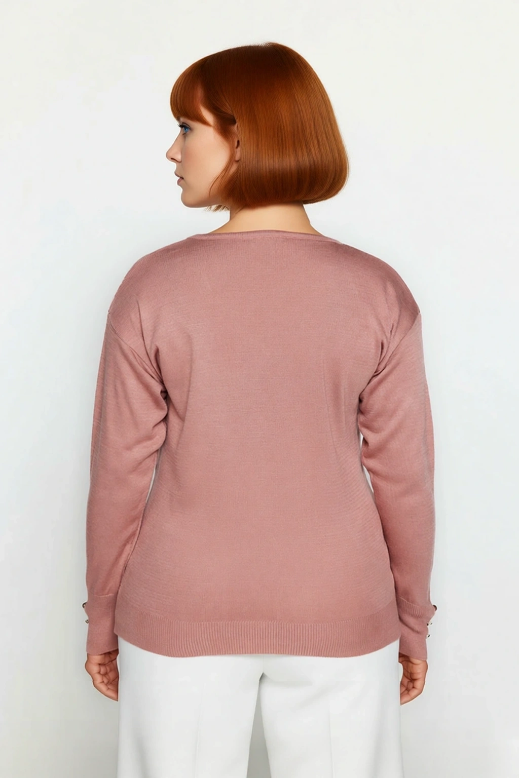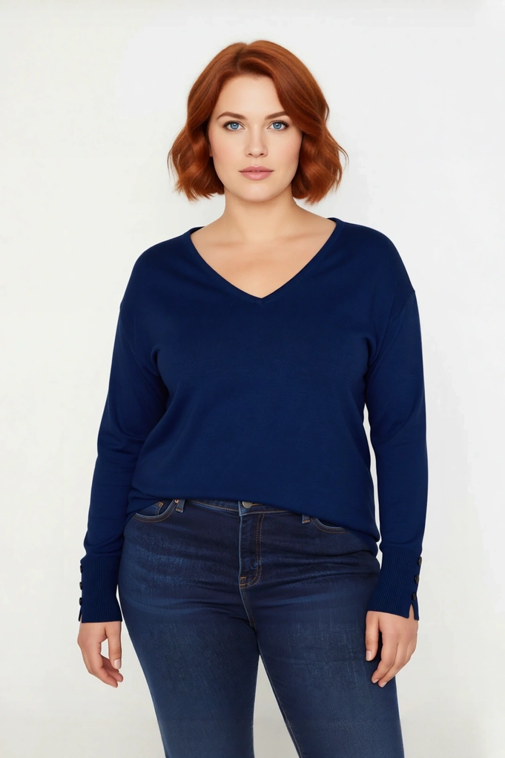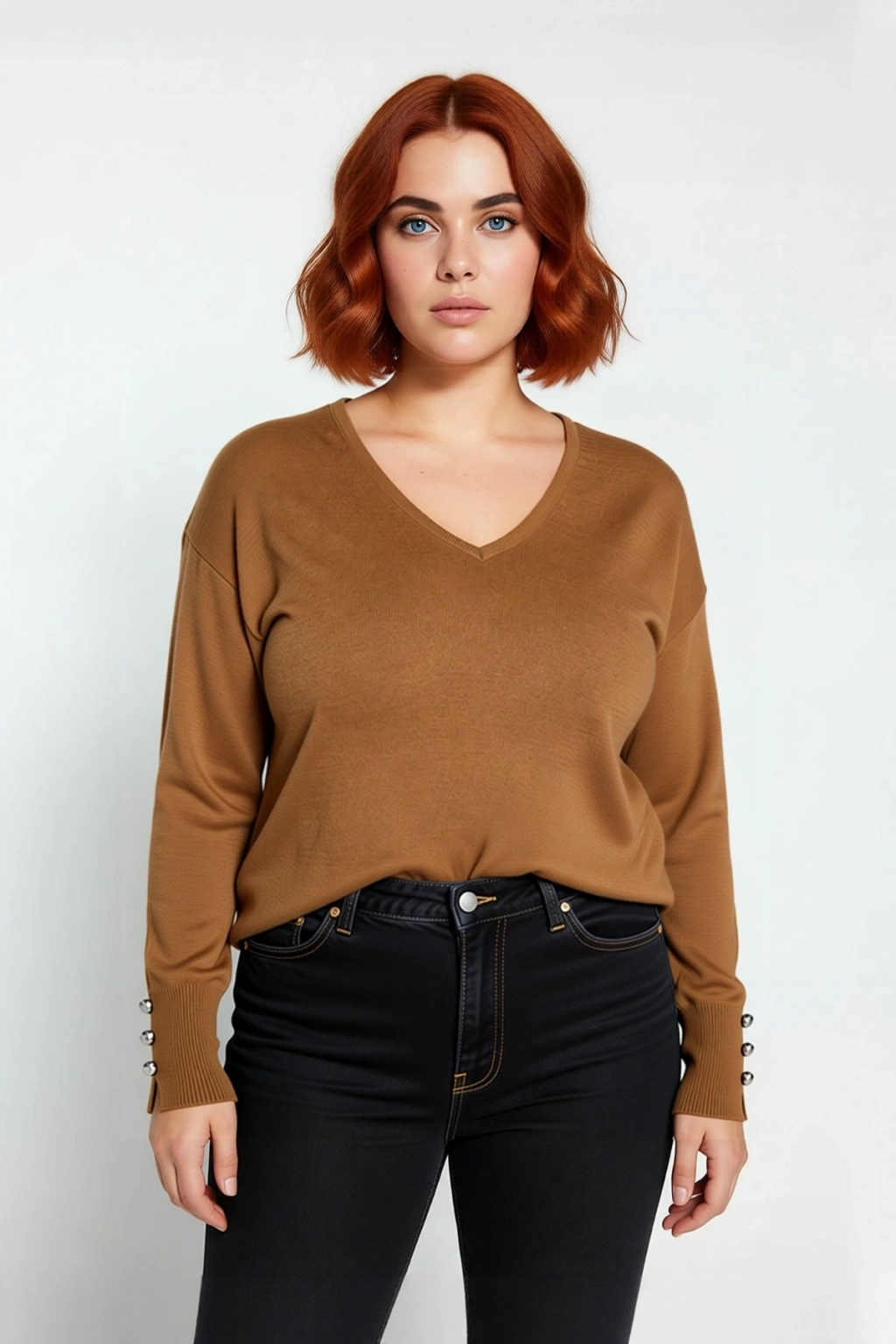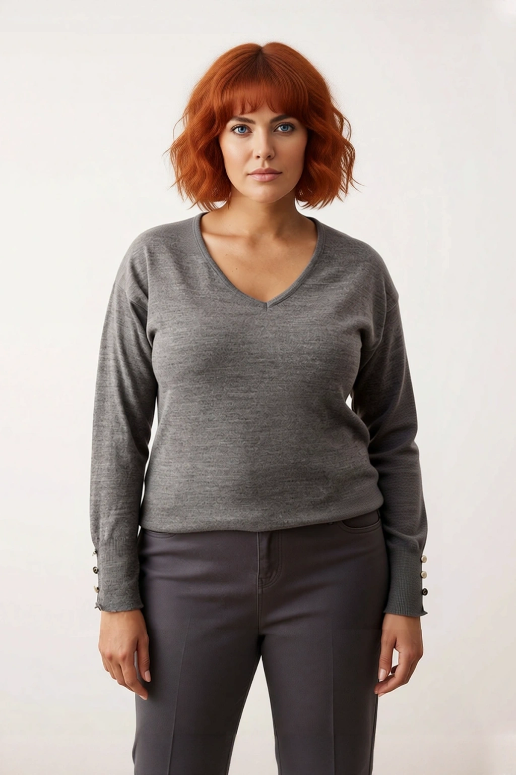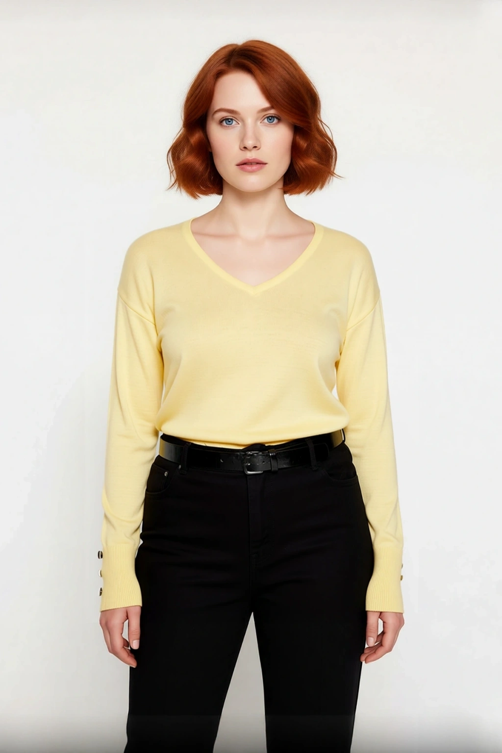 Klasik V yaka tipi, feminen bir dokunuş katarken, standart kol yapısı rahat hareket imkanı sağlar. Uzun kolları, özellikle serin havalarda ekstra sıcaklık sunarken, kol ağzındaki parlak düğme detayları kazağa göz alıcı bir şıklık katar. İnce dokulu triko kumaşı, nefes alabilirliği sayesinde cildinizin gün boyu rahat etmesini sağlar. Tek plaka dokuma tekniği ile üretilen bu kazak, hafif yapısıyla katmanlı giyime oldukça uygundur. Bakım kolaylığı sunan T41 yıkama talimatı ile pratik bir kullanım sunar.