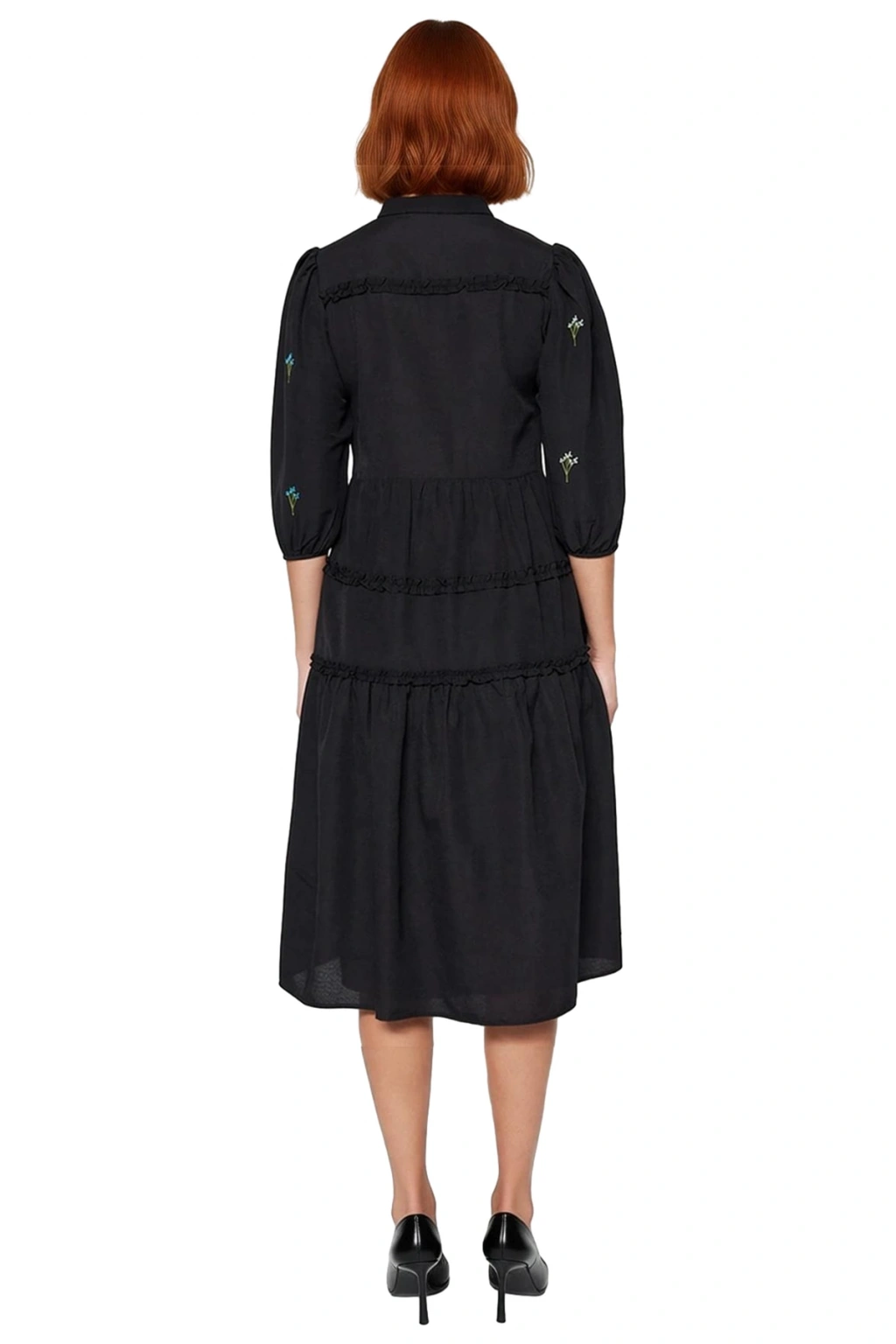Hakim yaka tasarımı, modern bir dokunuşla klasik zarafeti bir araya getirirken, yarım pat düğme detayı pratik bir kullanım imkanı sunar. Balon kolun hacimli ve havalı duruşu, elbiseye dinamik bir karakter kazandırır. Astarsız yapısı sayesinde mevsim geçişlerinde ideal bir seçenek olan bu midi boy elbise, hareket özgürlüğünü kısıtlamaz. Polyester ve pamuk karışımı materyal bileşeni sayesinde dayanıklı ve uzun ömürlüdür, makinede yıkanabilir özelliği ile bakımı da son derece kolaydır.