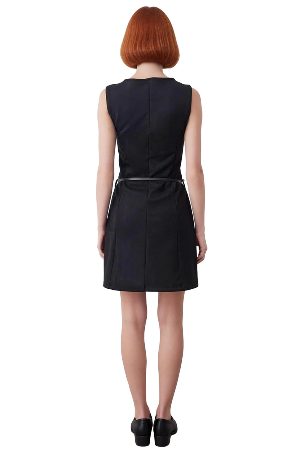 Elbisenin zarif bisiklet yaka tasarımı, boyun bölgesine hoş bir görünüm kazandırır. Kolsuz yapısı, elbiseye modern ve havadar bir hava katarken, farklı üst giyim parçalarıyla kombinleme özgürlüğü sunar. Süet dokuma kumaş tipi, pürüzsüz ve kaliteli bir his verir. Astarsız tasarımı hafiflik ve rahatlık sağlarken, kısa/mini boyu ile genç ve dinamik bir stil yaratmanıza olanak tanır. Gündüzden geceye her ortama uyum sağlayabilen bu elbise, gardırobunuzun en kullanışlı parçalarından biri olacak.