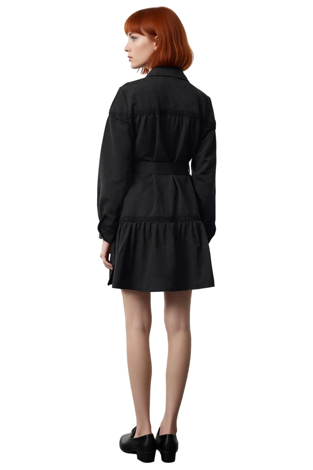 Ürün Özellikleri: Gömlek elbise kalıp, pamuklu materyal, düz desen, gömlek yaka, standart kol, dokuma flanel kumaş, siyah renk, dantel detaylı, kuşaklı, mini boy, cepsiz, astarsız.