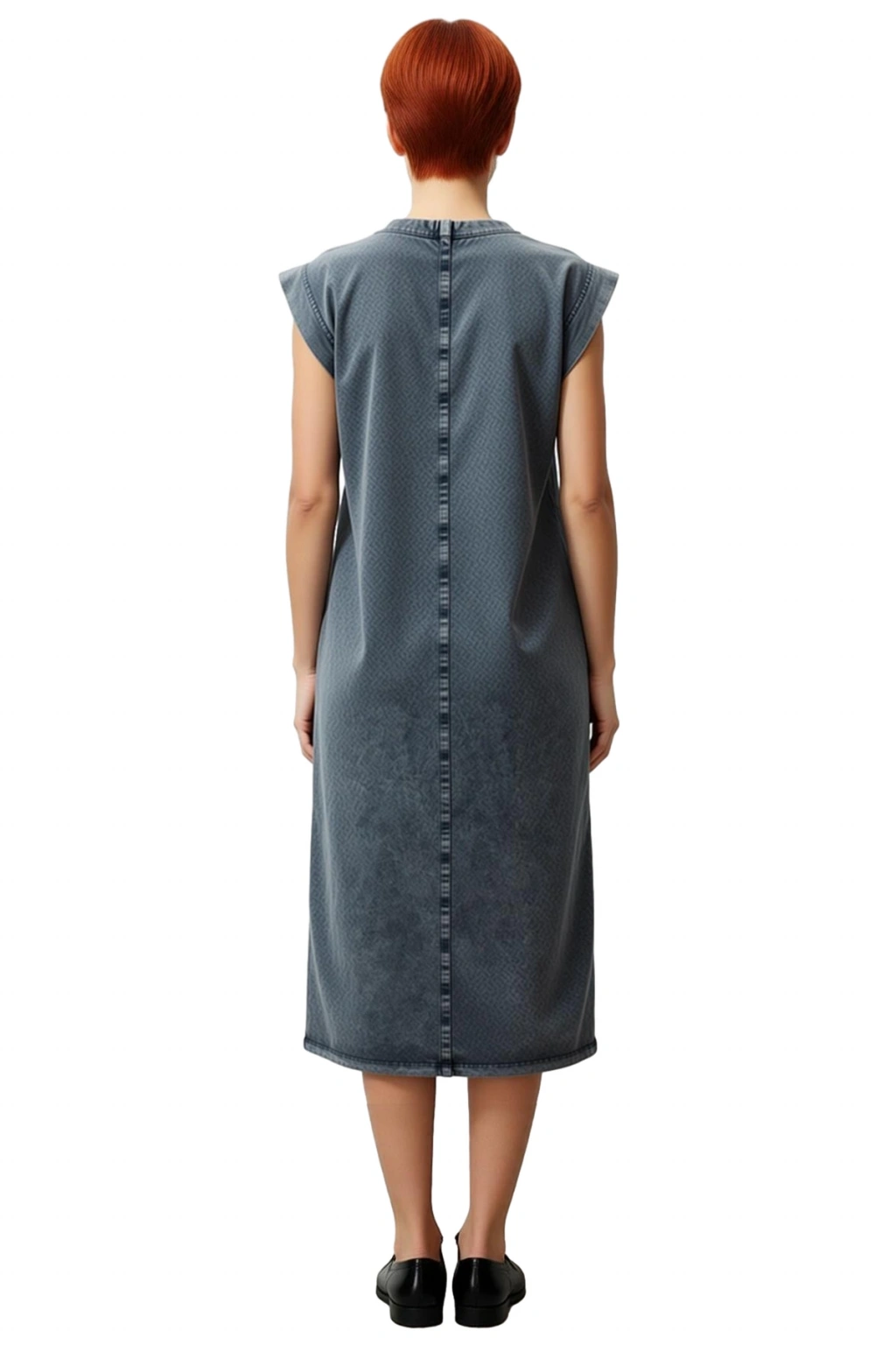 %100 pamuk kumaşının yumuşak dokusu ve nefes alabilir özelliği, gün boyu konforlu bir kullanım sağlar. Relaxed kalıp, vücut hatlarınızı ortaya çıkarmadan rahat bir uyum sunar. Kısa ay kolları ve bisiklet yakası, elbiseye modern ve minimalist bir görünüm kazandırır. Eskitme/soluk efektli detaylar, elbiseye vintage esintileri taşırken, yırtmaç detayı ise dinamik bir görünüm yaratır. Cepsiz tasarımı, şıklığını korurken minimal bir estetik sağlar.