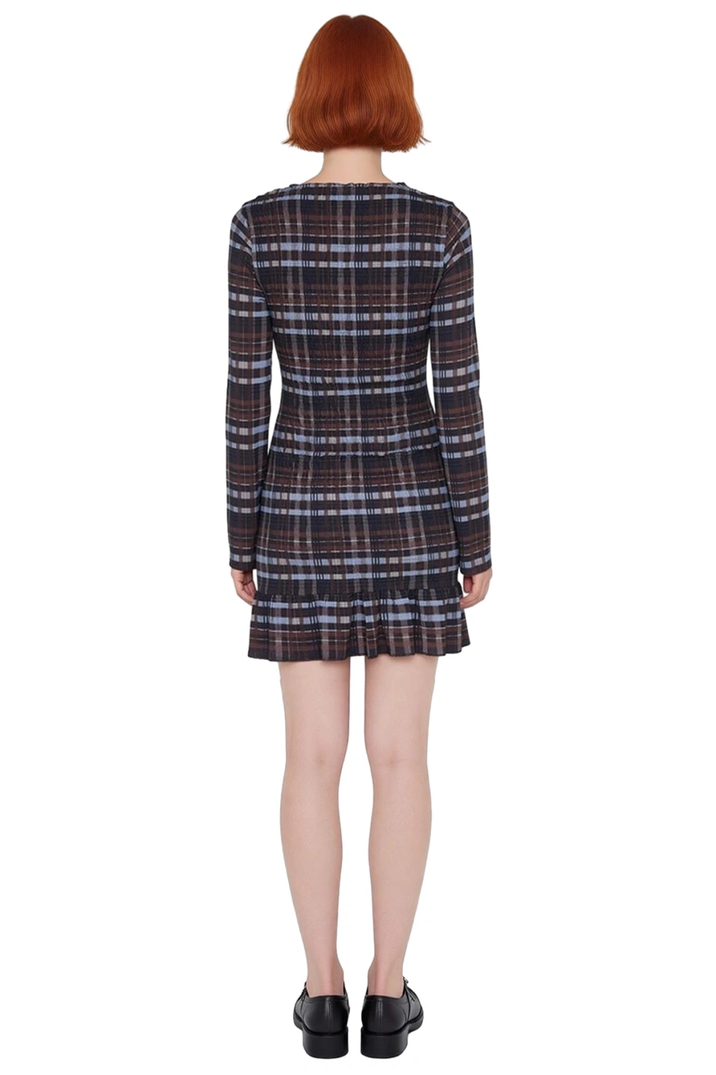 Ürün Özellikleri: Bodycon kalıp, 99% Polyester 1% Elastan materyal, ekose kareli desen, bisiklet yaka, standart kol, örme bürümcük kumaş, kahverengi-ekose renk, gipeli tasarım, astarsız.