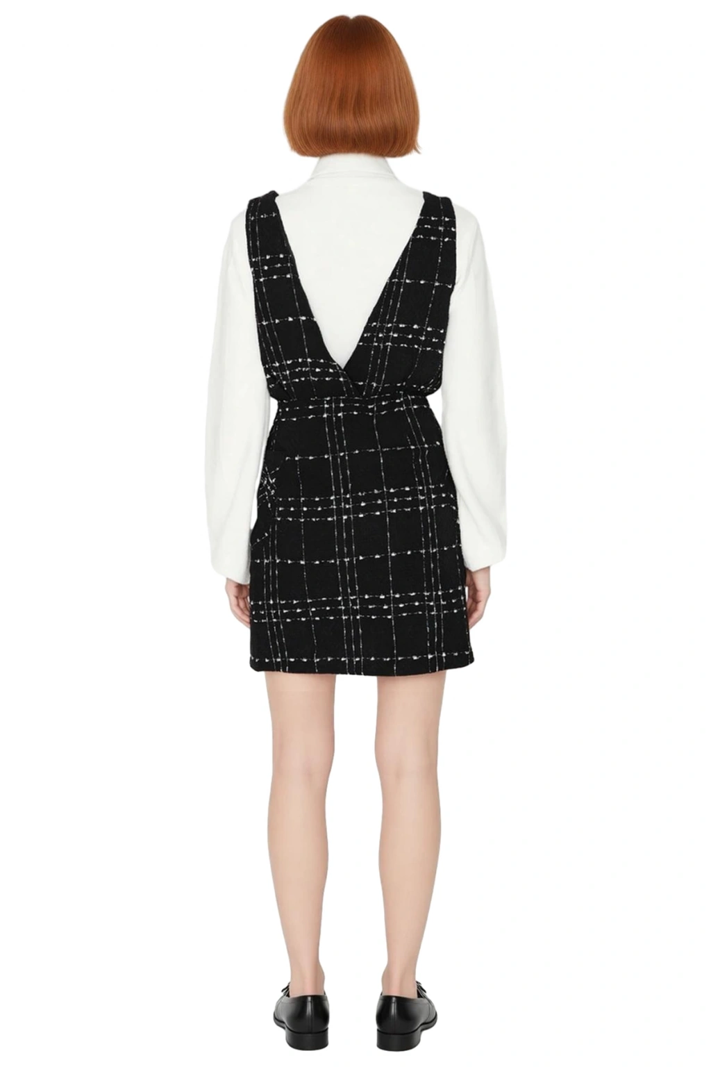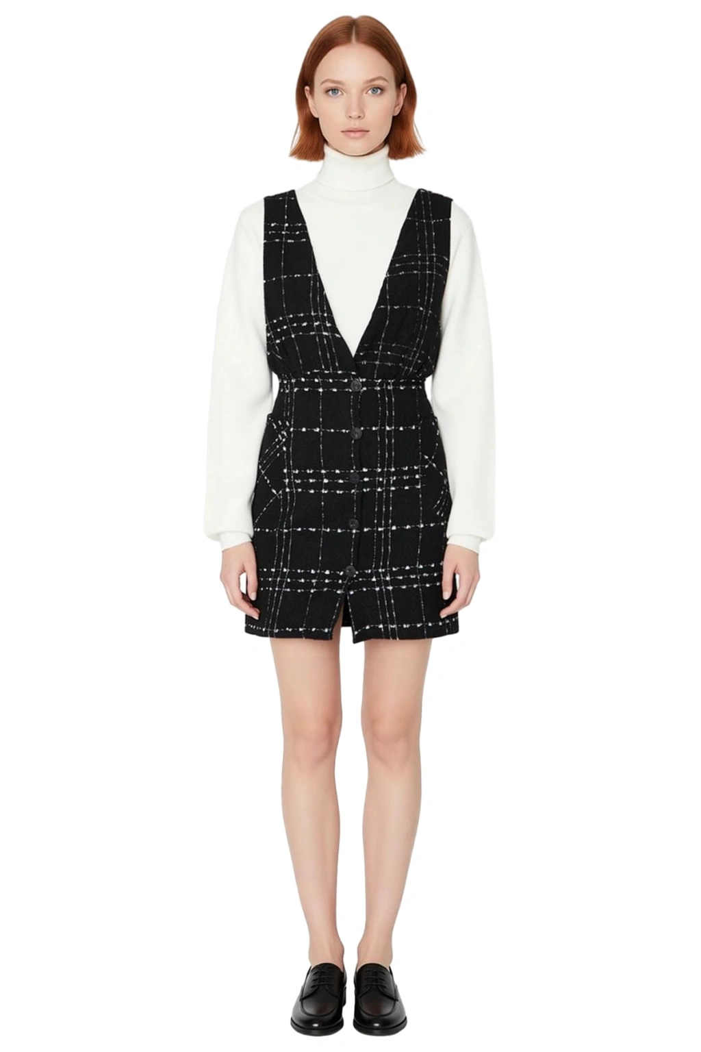Ürün Özellikleri: Jile kalıp, polyester karışımlı materyal, ekose kareli desen, V yaka, kolsuz, dokuma tüvit kumaş, siyah renk.