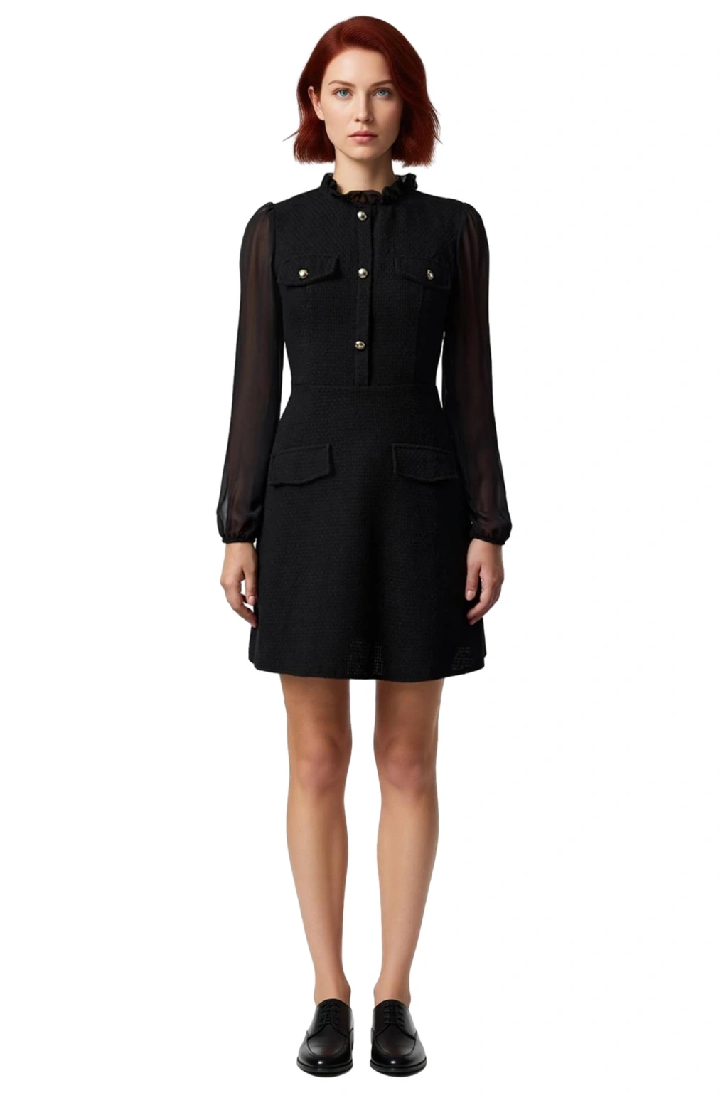 Elbisenin dik yaka detayı, klasik bir zarafet sunarken, uzun balon kolları modern ve havalı bir görünüm kazandırır. Astarsız yapısı sayesinde hafif ve konforlu bir giyim deneyimi sunar. Tüvit kumaşın özgün dokusu, elbiseye derinlik katarak sıradanlığın ötesine taşır. Ön bölümdeki şık düğme ve dekoratif cep uygulamaları, elbiseye sofistike bir hava verir. Yüksek kaliteli işçilik sayesinde dayanıklılığı artırılmış, T10 yıkama talimatı ile de pratik bir bakıma sahiptir.
