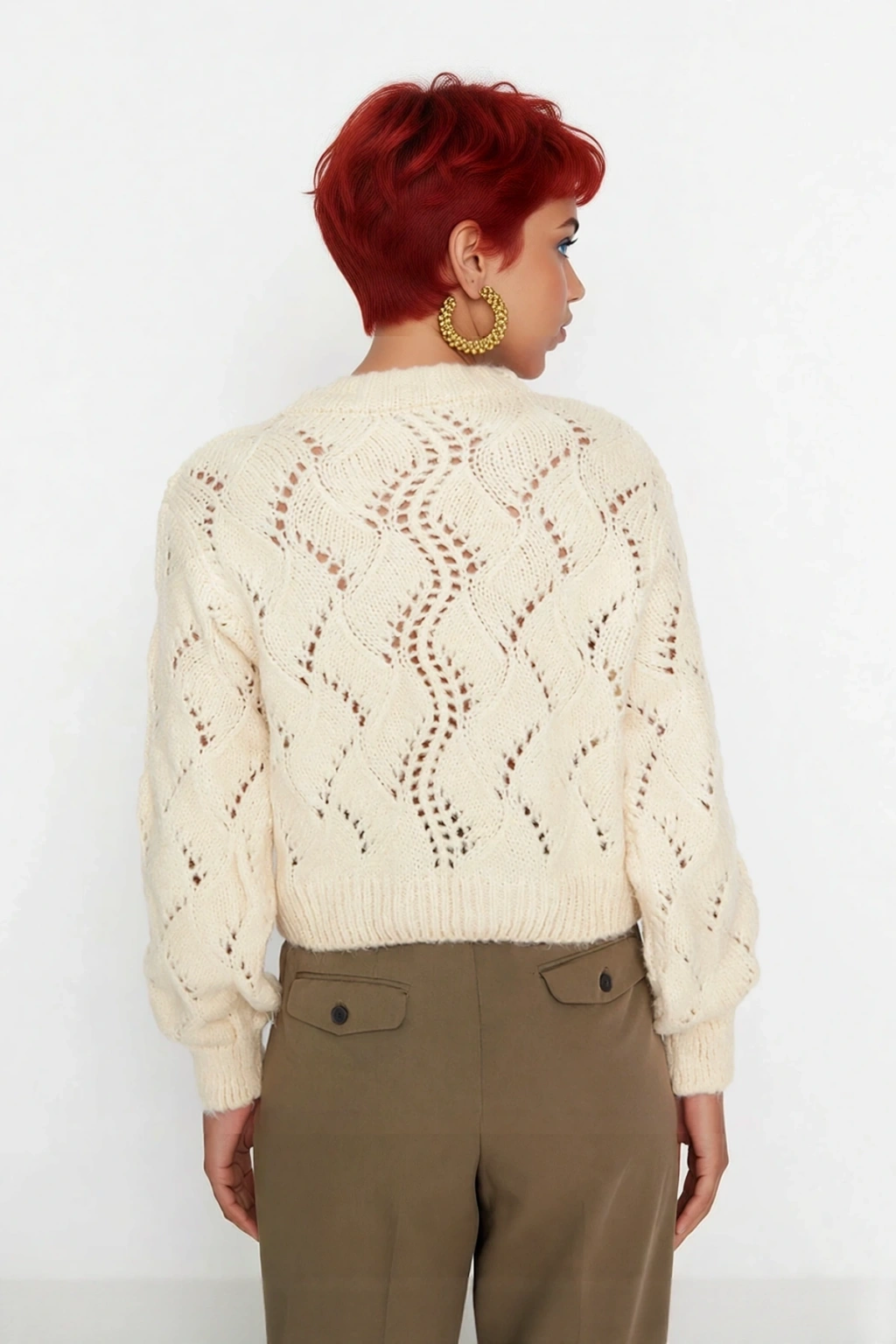 Ürün Özellikleri: Regular kalıp, akrilik materyal, ajurlu desen, dik yaka, standart kol, triko kumaş, ekru renk, cepsiz, uzun kol boyu, basic siluet, super crop boy, çift plaka dokuma tipi, %80 akrilik %20 polyester materyal bileşeni.