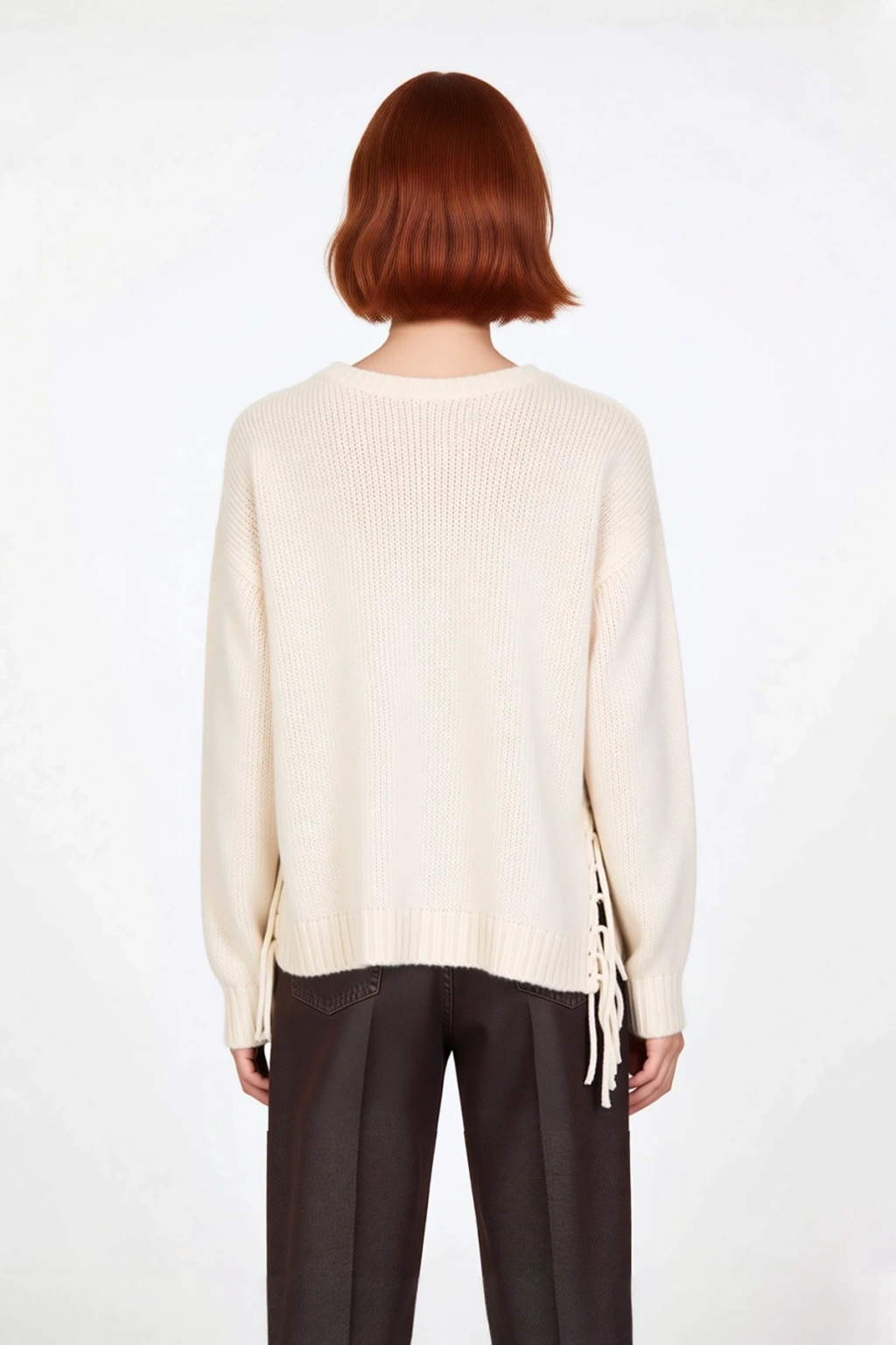 Ürün Özellikleri: Oversize kalıp, akrilik polyester karışım materyal, düz püskül detaylı desen, bisiklet yaka, düşük kol, triko kumaş, ekru renk.