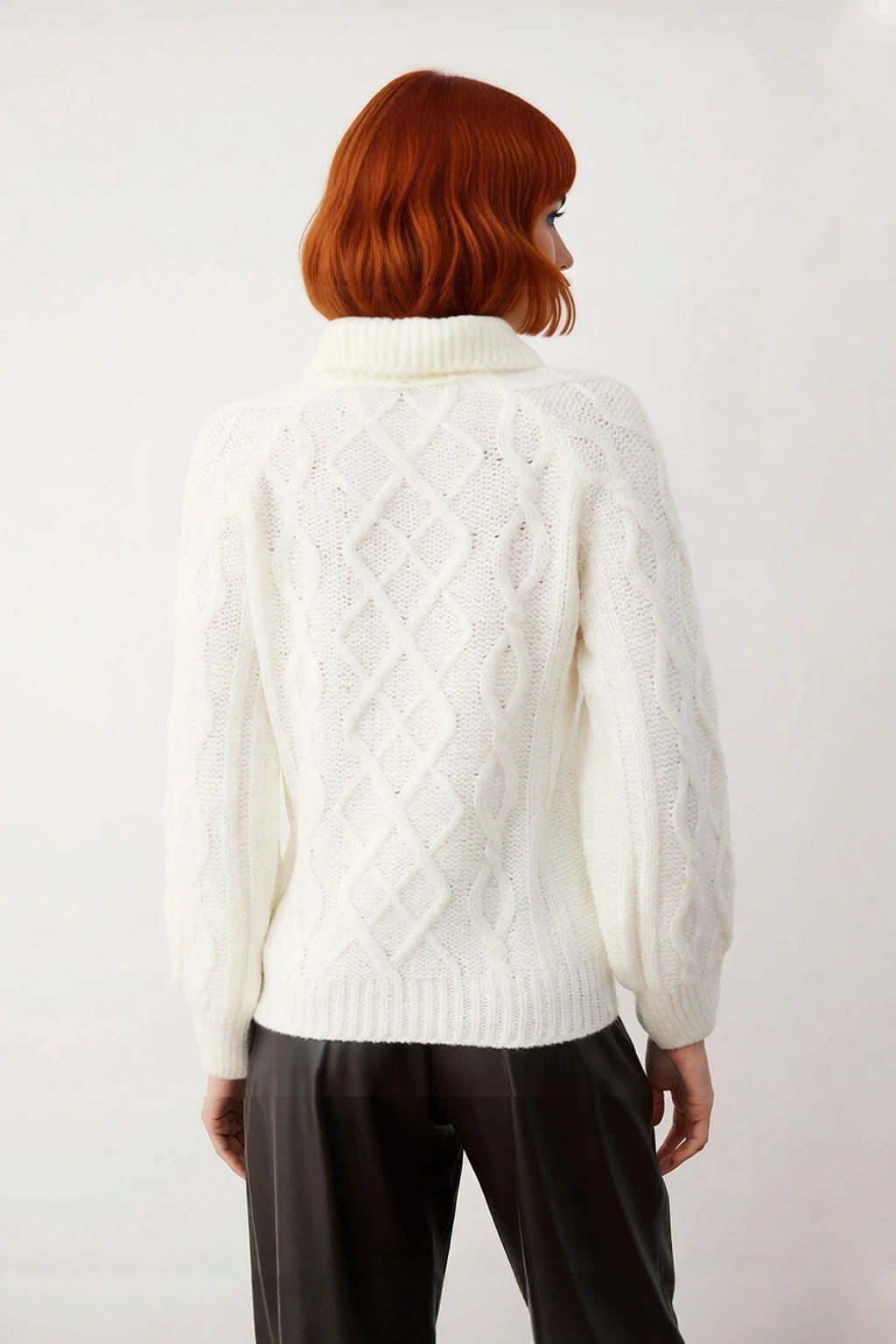 Ürün Özellikleri: Regular kalıp, triko kumaş, saç örgü desen, gömlek yaka, düşük kol, orta kalınlık, uzun boy, ekru renk.