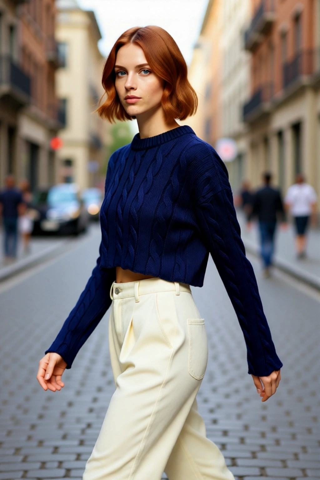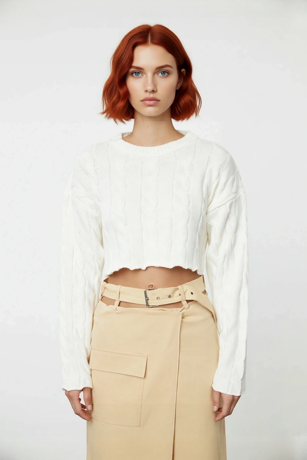 Ürün Özellikleri: Regular kalıp, %100 akrilik materyal, saç örgü desen, bisiklet yaka, standart uzun kol, triko kumaş, ekru renk, süper crop boy.