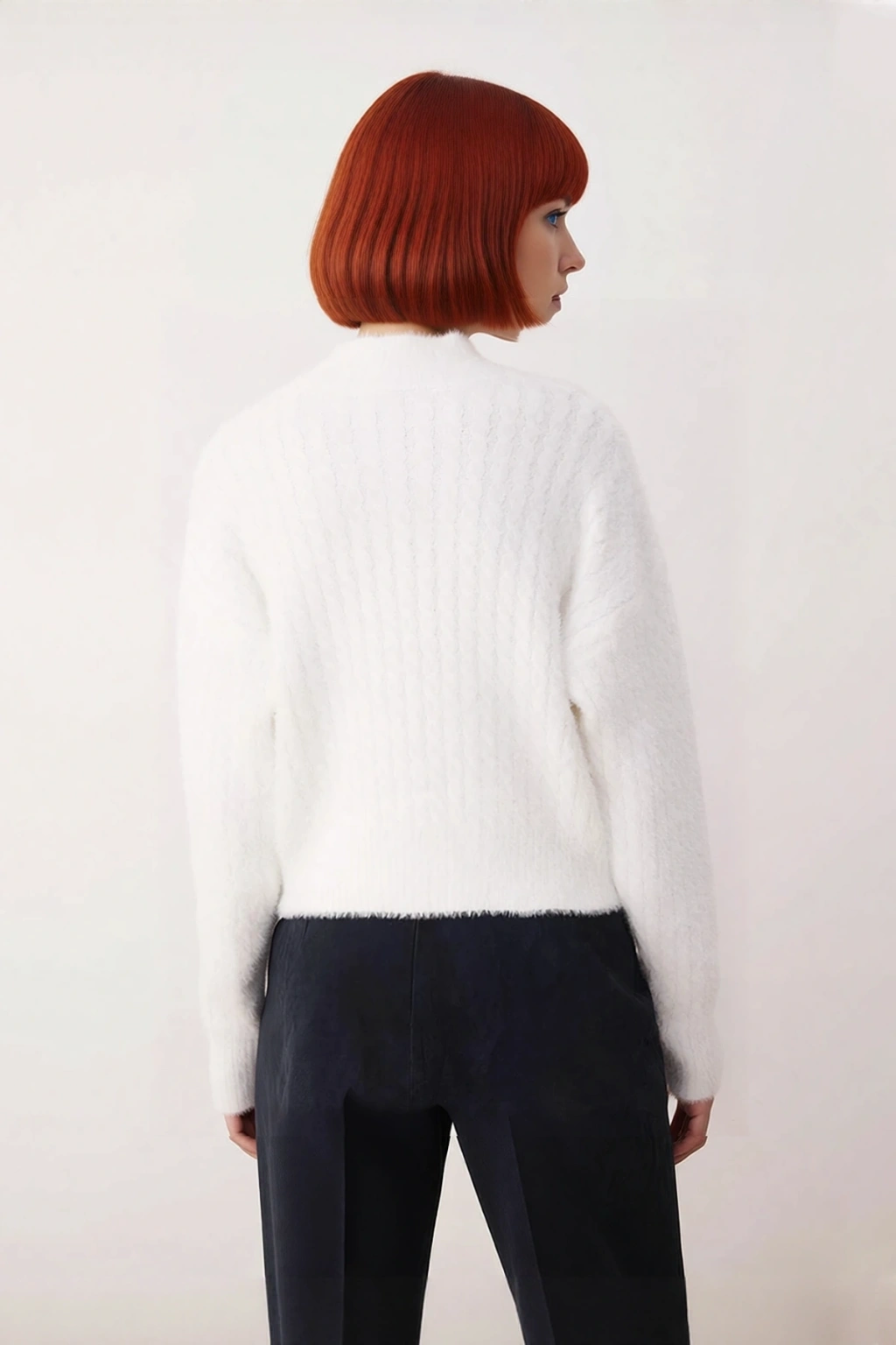Ürün Özellikleri: Regular kalıp, akrilik karışımlı materyal, saç örgü desen, dik yaka, düşük kol, triko kumaş, ekru renk.