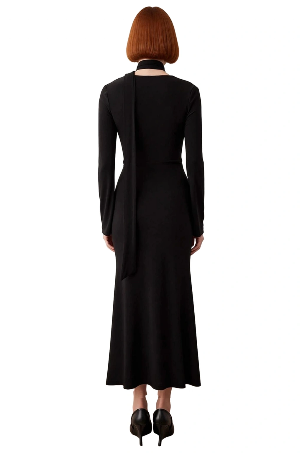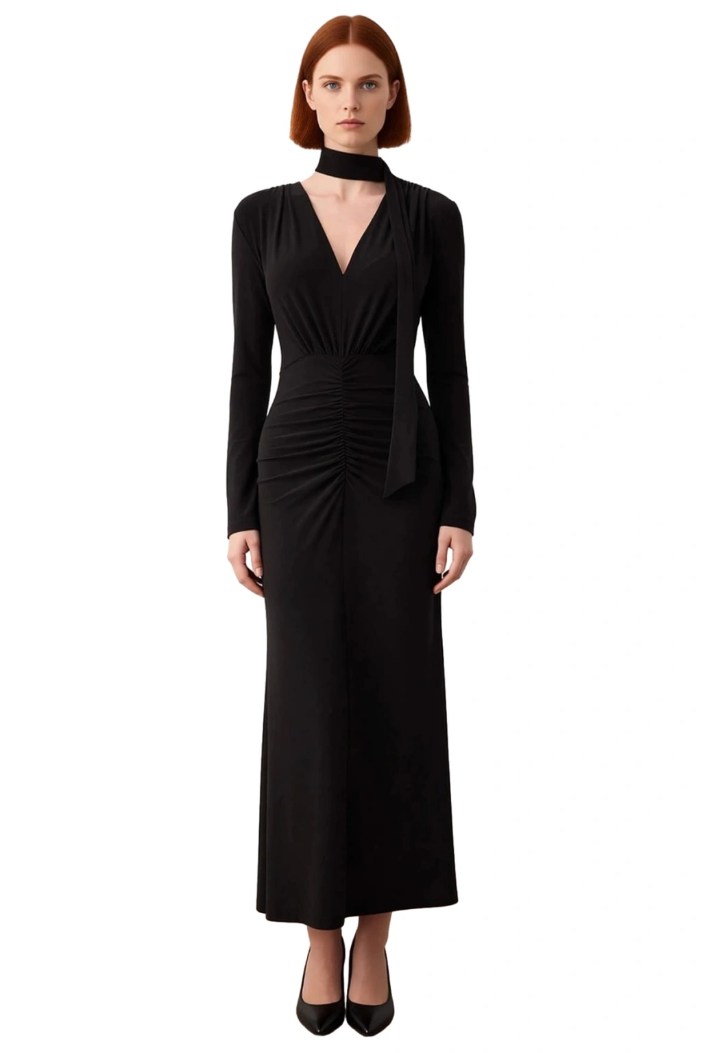 Moda öncüsü kadınların tercihi olan bu siyah bodycon maxi elbise, vücuda oturan kesimiyle sofistike bir duruş sergiler. Yüksek kaliteli polyester ve elastan karışımı olan esnek kumaşı, gün boyu rahatlık ve şıklığı bir arada sunar. Düz deseni sayesinde zamansız bir zarafet taşırken, yaka kısmından inen kuşak detayı elbiseye özgün ve modern bir hava katar. Bu elbise, özel davetlerde ve şık gecelerde tüm gözleri üzerinize çekecek, kendinizi özel hissetmenizi sağlayacaktır.