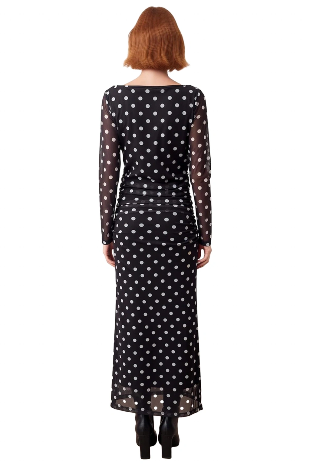 Ürün Özellikleri: Bodycon kalıp, %94 polyester %6 elastan materyal, puantiyeli desen, V yaka, standart uzun kol, tül örme kumaş, siyah renk, büzgü / drape detayı, astarsız.