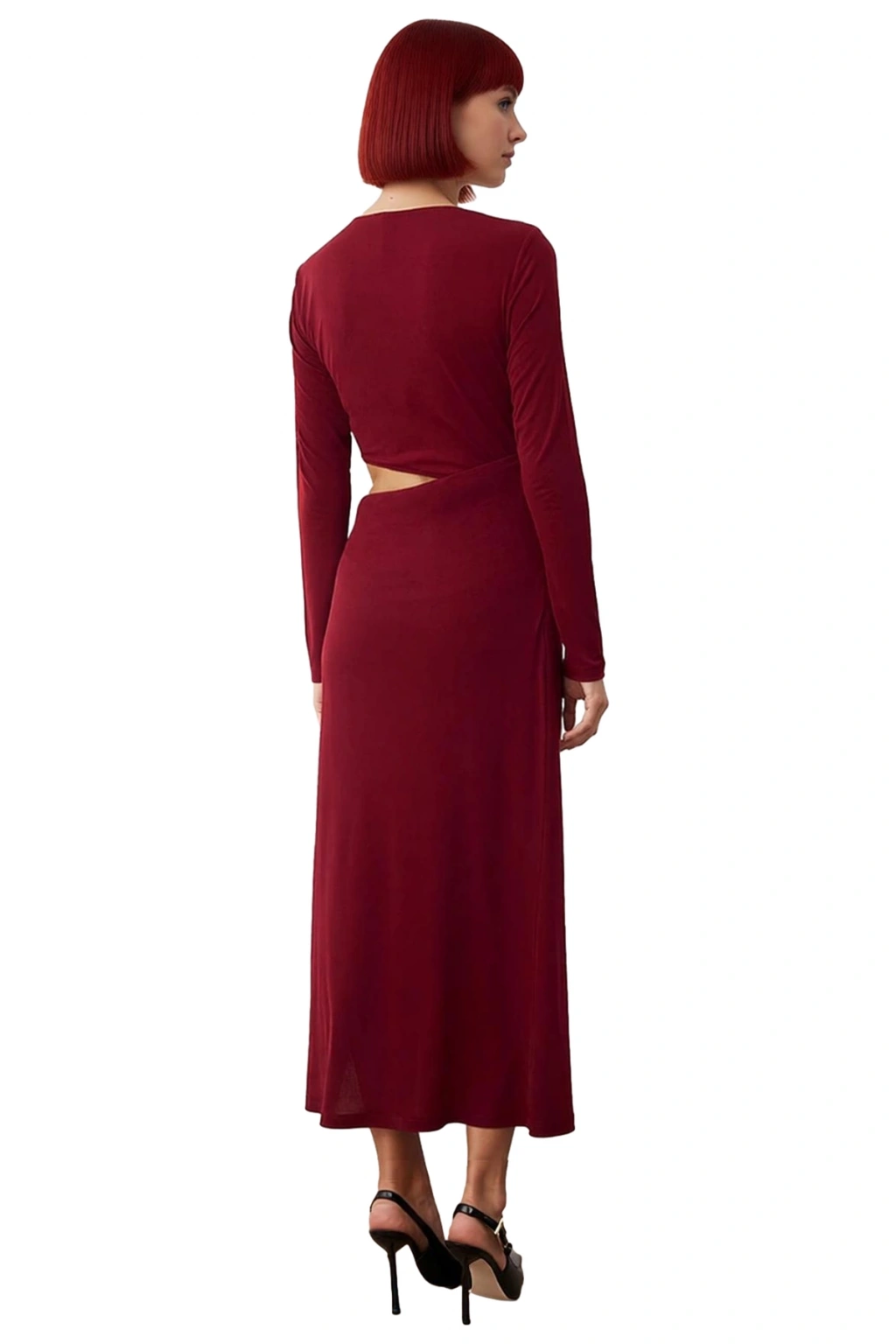 Ürün Özellikleri: Bodycon kalıp, polyester elastan materyal, düz desen, bisiklet yaka, standart uzun kol, örme sandy kumaş, bordo renk, aksesuar ve bel cut-out detaylı.
