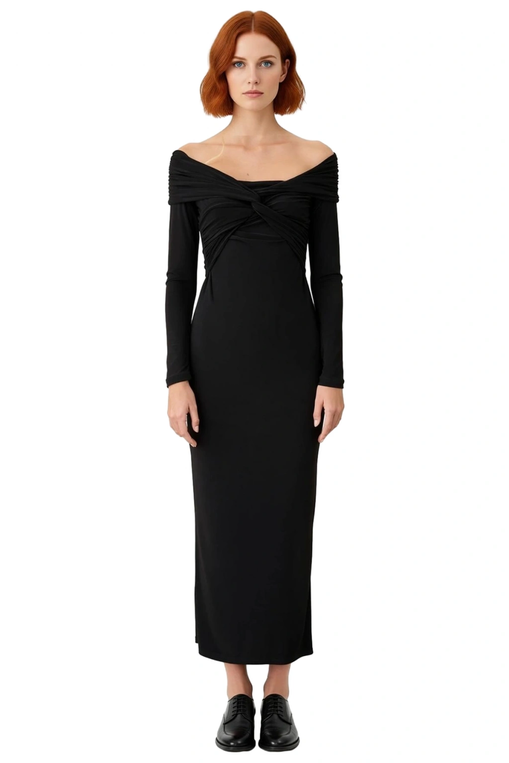 Ürün Özellikleri: Bodycon kalıp, polyester elastan materyal, düz desen, carmen yaka, standart uzun kol, örme sandy kumaş, siyah renk, astarsız tasarım.