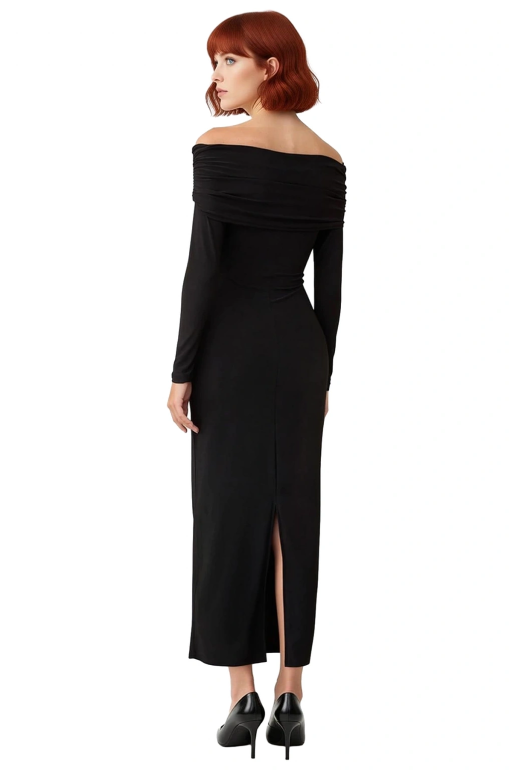 Ürün Özellikleri: Bodycon kalıp, polyester elastan materyal, düz desen, carmen yaka, standart uzun kol, örme sandy kumaş, siyah renk, astarsız tasarım.