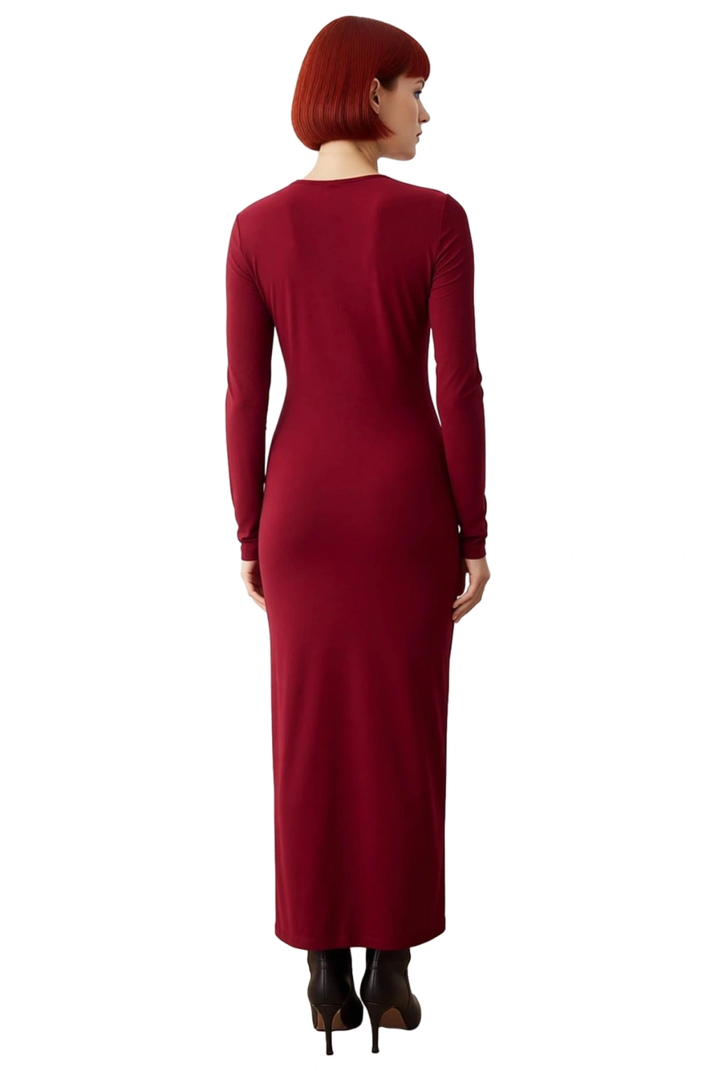 Ürün Özellikleri: Bodycon kalıp, polyester elastan materyal, düz desen, havuz yaka, standart kol, örme kumaş, bordo renk, aksesuar detaylı.