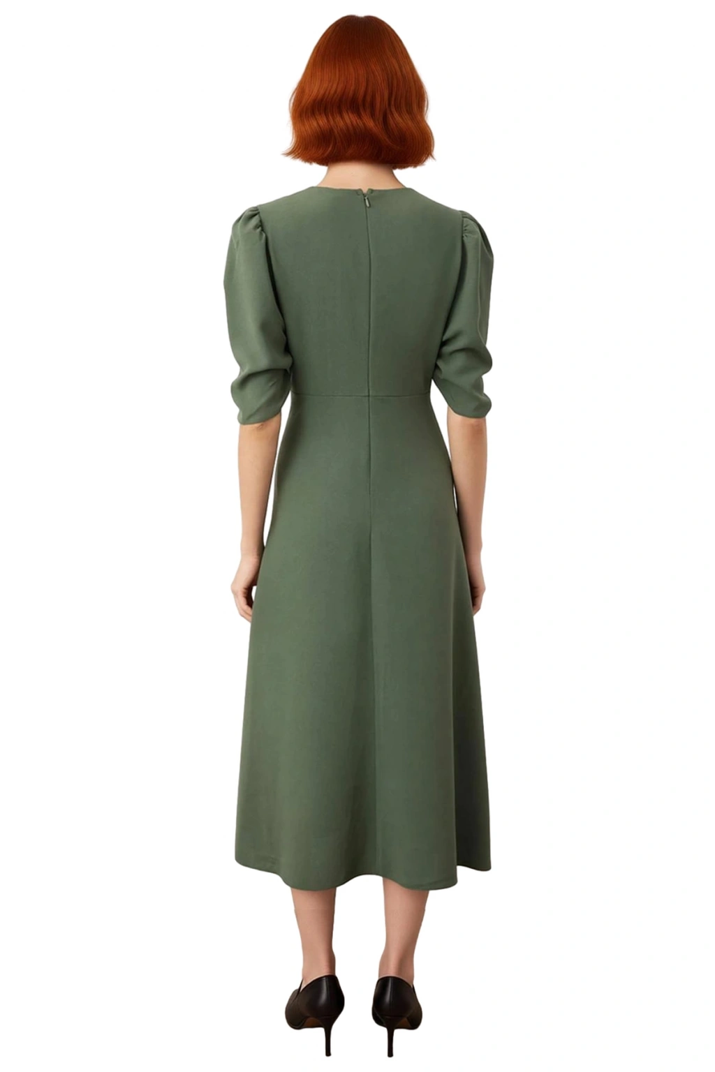 Ürün Özellikleri: Skater kalıp, %100 polyester materyal, düz desen, V yaka, truvakar kol, büzgülü/fırfırlı kol tipi, dokuma krep kumaş, midi boy, haki renk, astarsız, casual/günlük.