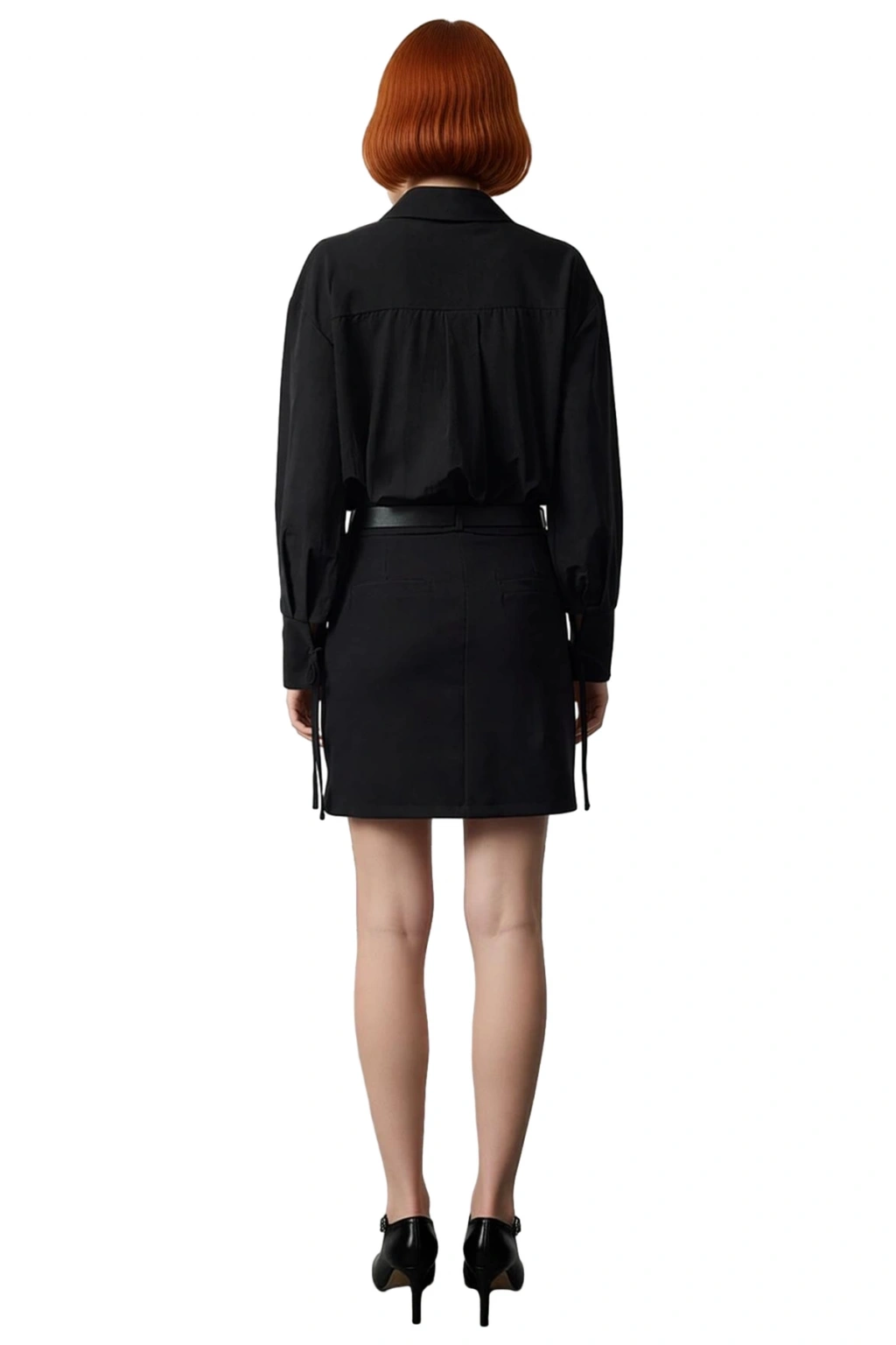 Kadın Fashion Forward Siyah Kemer Tokalı Mini Gömlek Elbise, dinamik ve modern bir stilin anahtarıdır. Gömlek elbise kalıbı, gün boyu süren rahatlığı şıklıkla birleştirerek her anınıza eşlik eder. Polyester karışımlı dokuma kumaşı, yumuşak dokusu ve dayanıklılığıyla öne çıkar. Düz desenli ve baskısız siyah rengi, gardırobunuzun vazgeçilmez temel parçalarından biri olmaya adaydır. Kemerli detayı ve kemer tokası kapama şekli, elbiseye zarif bir dokunuş katarken, belinizi vurgulayarak feminen bir görünüm sunar.