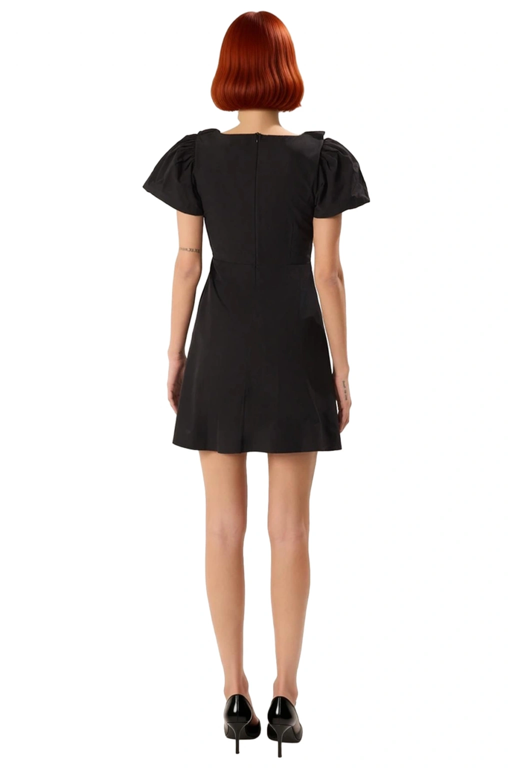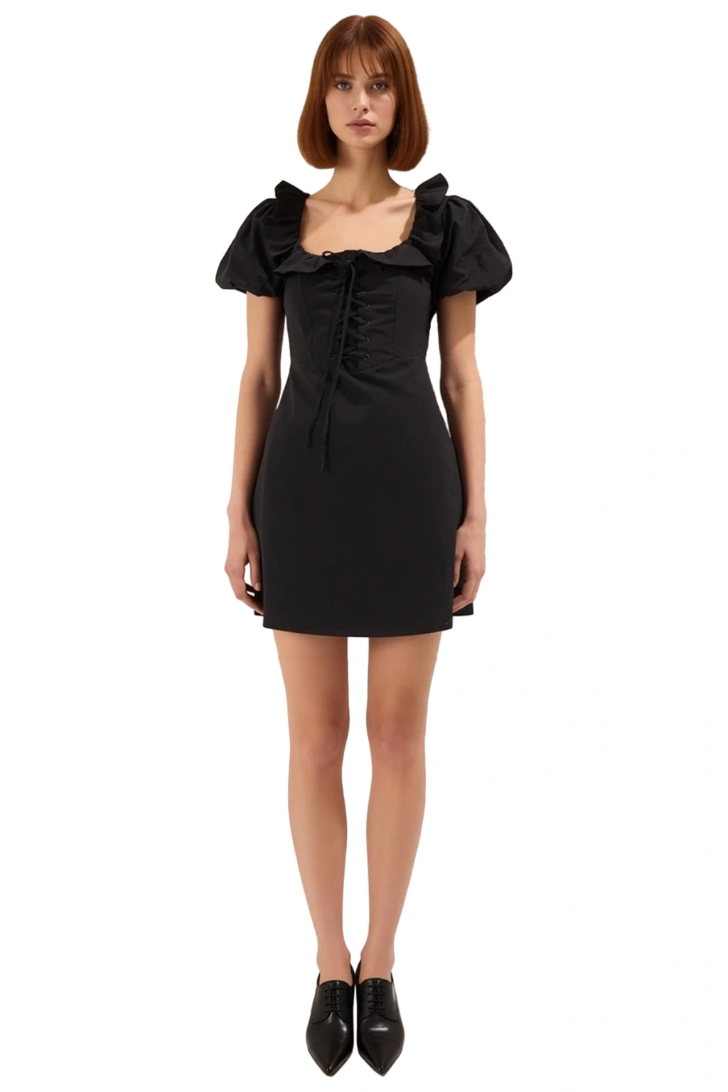 Ürün Özellikleri: Skater kalıp, 52% pamuk 48% polyester materyal, düz desen, kare yaka, balon kol, dokuma kumaş, siyah renk, astarsız, kısa/mini boy.