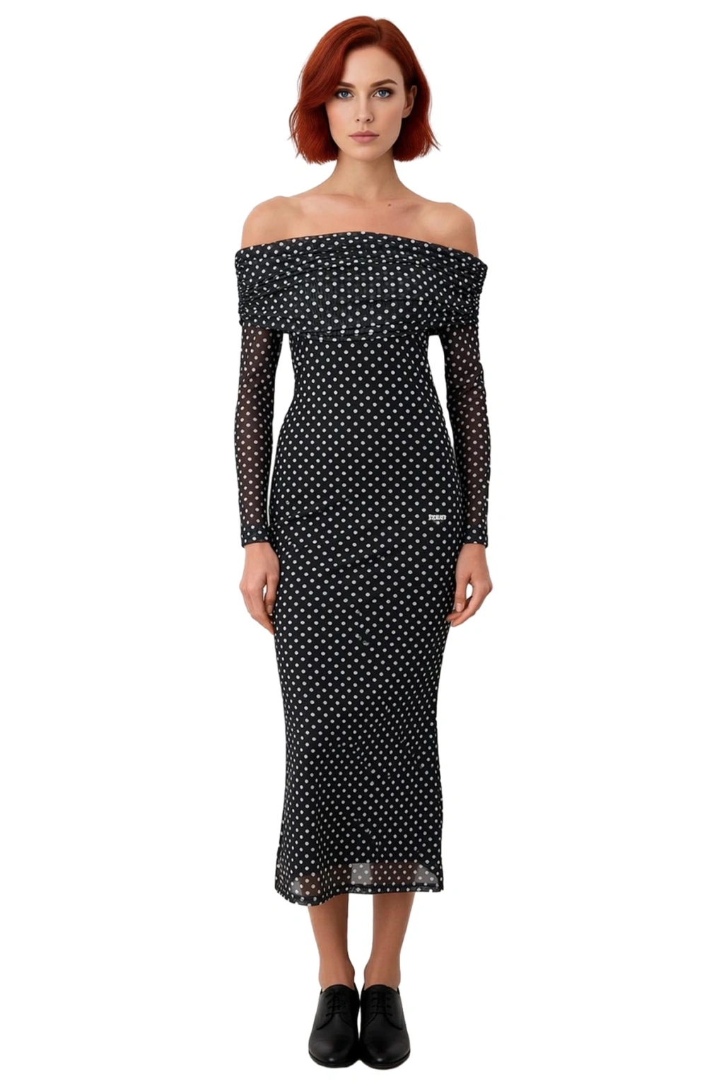 Ürün Özellikleri: Balık kalıp, 95% Polyester 5% Elastan materyal, puantiyeli desen, carmen yaka, standart kol, örme kumaş, siyah renk, astarlı tasarım.