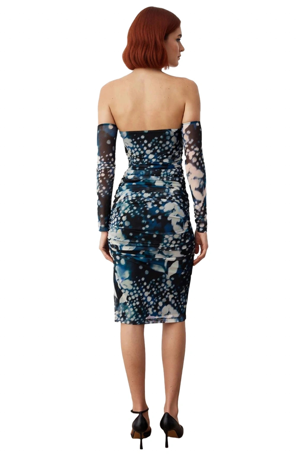Ürün Özellikleri: Bodycon kalıp, %95 polyester %5 elastan materyal, soyut desen, carmen yaka, ayrı uzun kol, örme tül kumaş, çok renkli.
