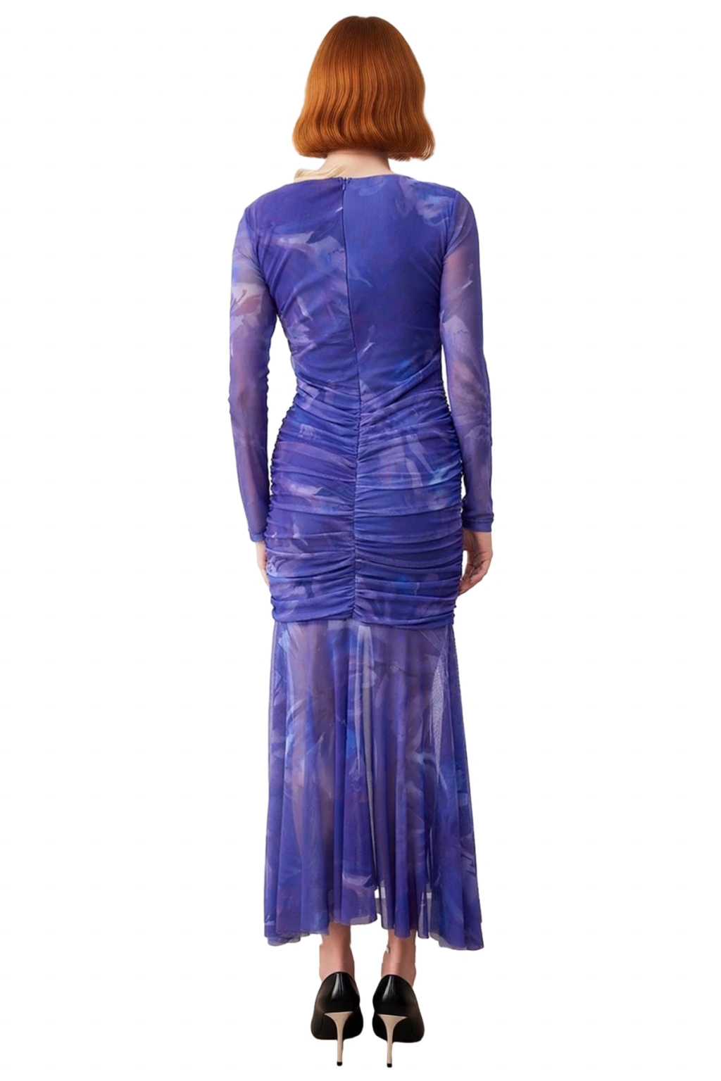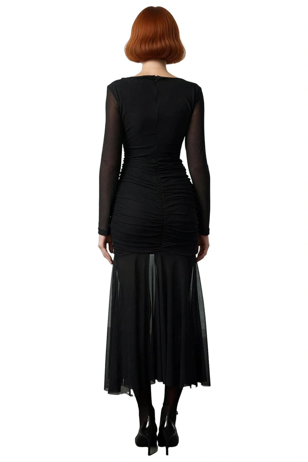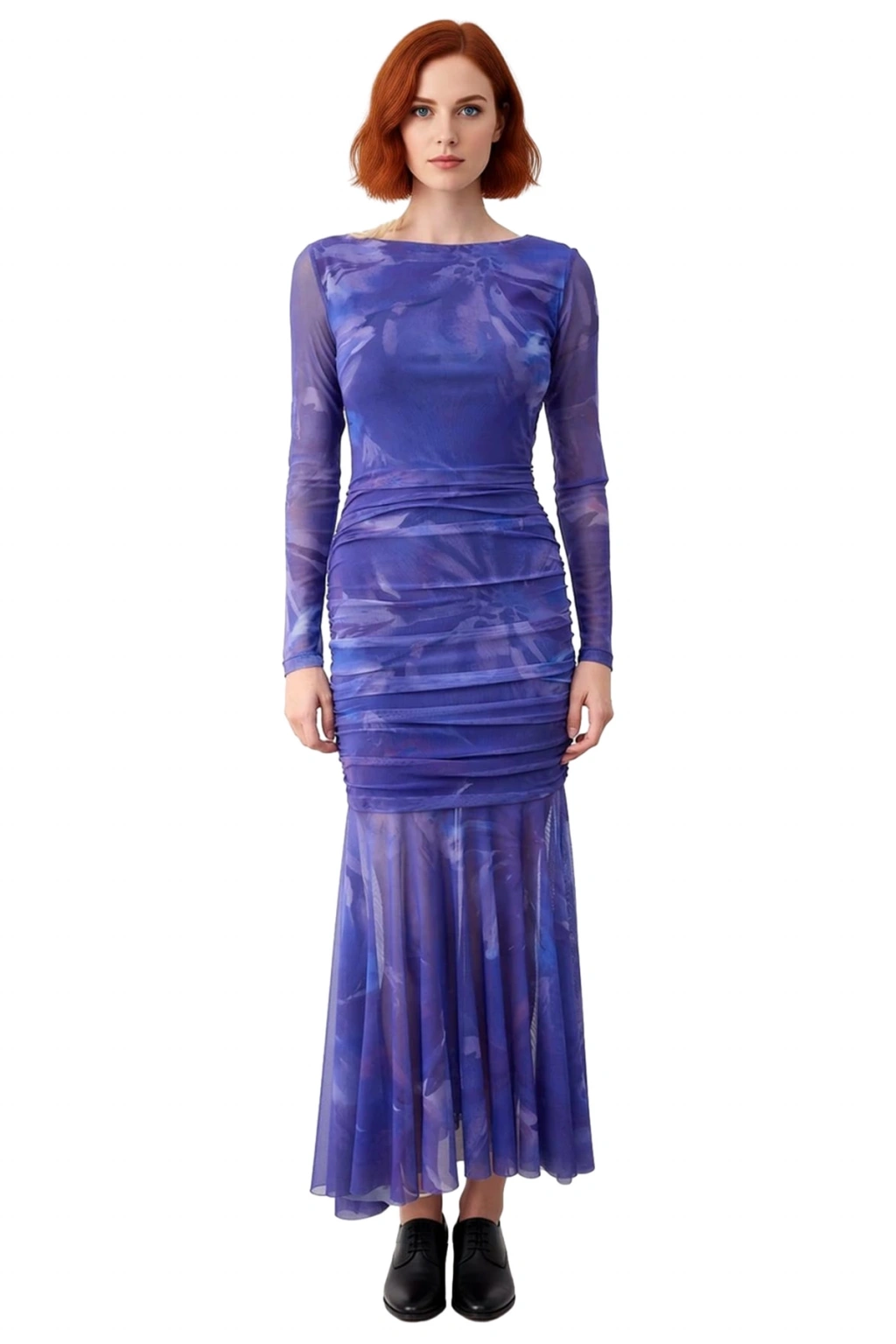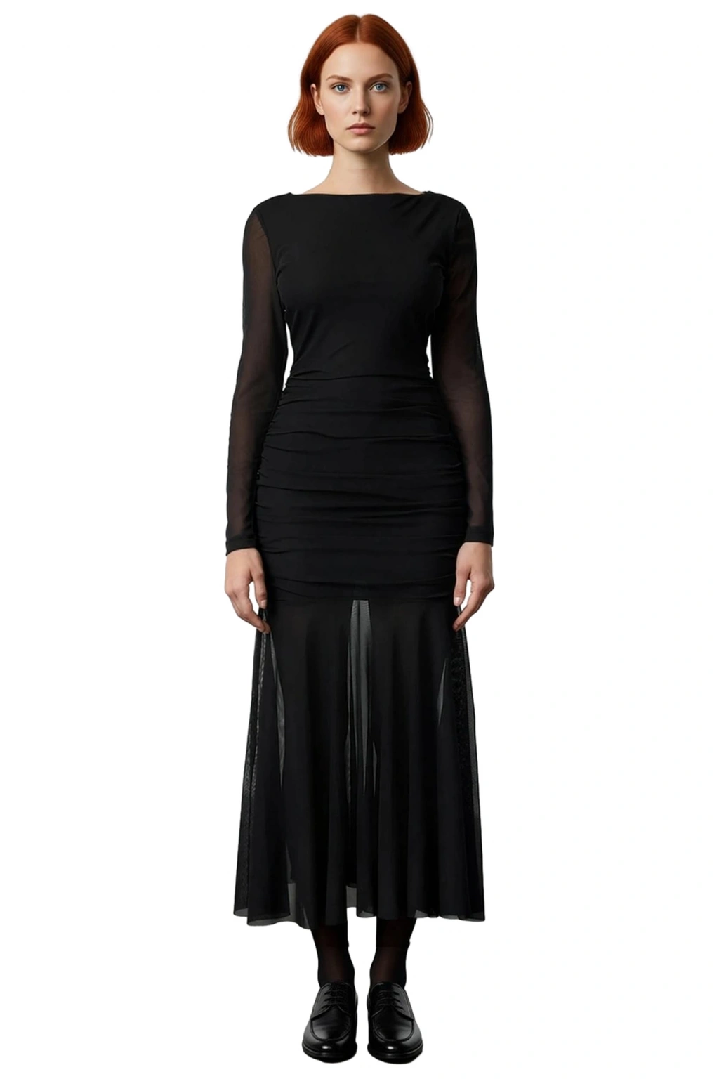 Kayık yaka detayı, sade ama etkileyici bir şıklık sunarak boyun ve omuz bölgesini nazikçe vurgular. Uzun standart kol yapısı, hem zarif bir duruş sergiler hem de mevsim geçişlerinde kullanım kolaylığı sağlar. Elbisenin genelinde yer alan büzgü ve drape detayları, silueti daha da güzelleştirerek vücuda oturan formunu güçlendirir. Astarlı yapısı sayesinde transparan endişesi olmadan güvenle giyilebilir. Tül dokuma ve örme kumaş kombinasyonu, nefes alabilen yapısıyla gün boyu rahatlık sunarken, maxi boyuyla da abiye tarzına uygun, uzun ve asil bir duruş sağlar.