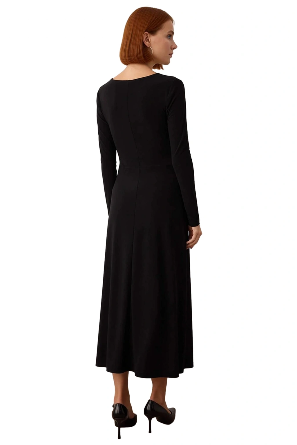 Ürün Özellikleri: A-line kalıp, 96% polyester 4% elastan materyal, düz desen, V yaka, standart kol, sandy kumaş, siyah renk.