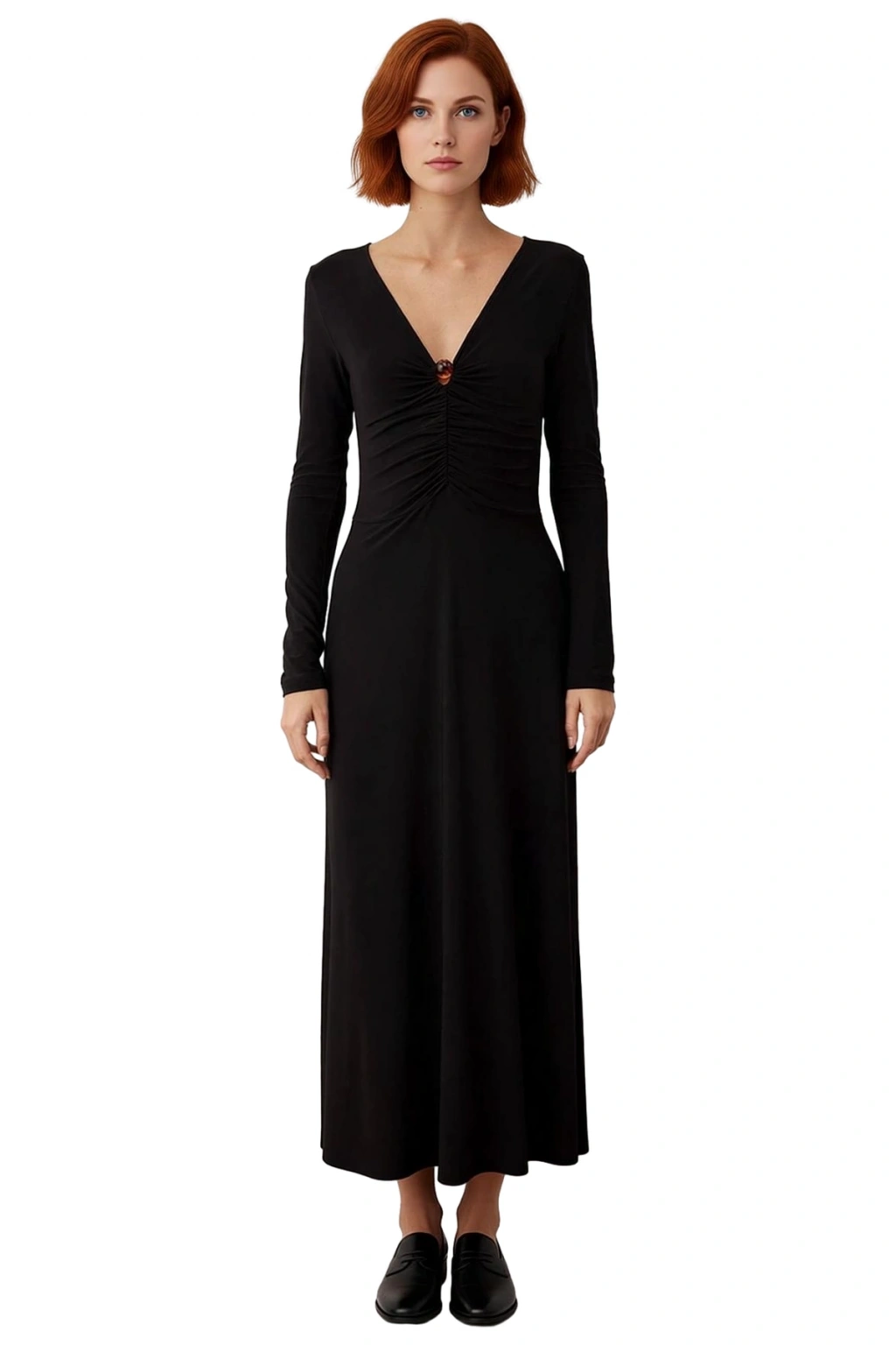 Fashion forward kadınların tercihi olan bu maxi elbise, modern tasarımı ve esnek yapısıyla dikkat çeker. A-line kalıbı, vücuda zarifçe oturarak akıcı bir siluet oluştururken, siyah rengi ve düz deseni ile her zaman şık bir seçenektir. 96% polyester ve 4% elastan materyal bileşimi, gün boyu konfor ve hareket özgürlüğü sunar. Özellikle V yaka kısmındaki büzgü detayı ve zarif aksesuarı, elbiseye dinamik ve sofistike bir hava katarak özel anlarınız için vazgeçilmez kılar.