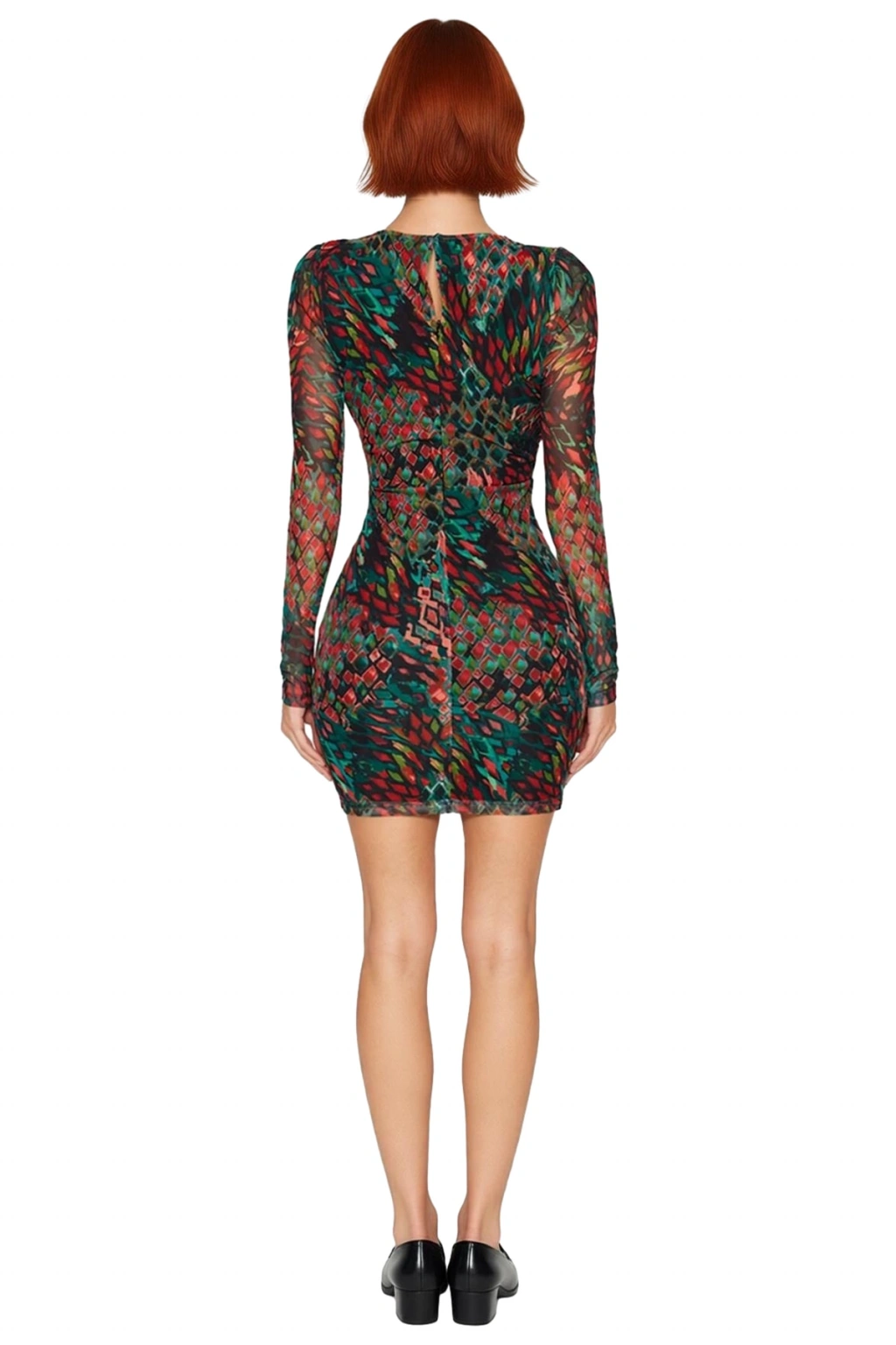 Ürün Özellikleri: Bodycon kalıp, polyester karışımlı materyal, soyut desen, v yaka, uzun standart kol, örme tül kumaş, çok renkli, astarlı, mini boy, büzgü drape detay.