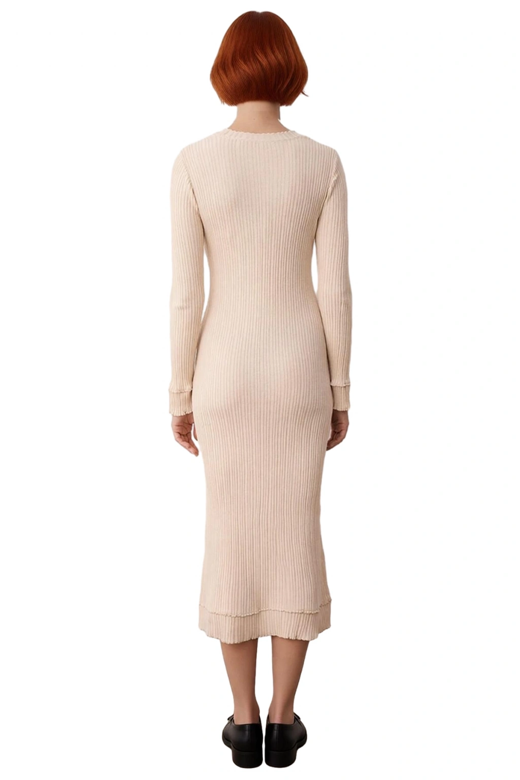 Bu triko elbise, vücuda oturan shift kalıbı ile modern ve zarif bir siluet sunarken, Cool & Comfort persona özelliği sayesinde gün boyu rahatlık sağlar. Yüksek kaliteli viskoz ve akrilik materyal bileşimi, yumuşak dokusuyla cildinize nazikçe temas ederken, fitilli dokuma tipi estetik bir derinlik katar. Düz deseni sade şıklığı ön plana çıkarırken, bej rengi zamansız ve kolay kombinlenebilir bir seçenek sunar. Uzun kolları ve midi boyu ile hem şık hem de fonksiyonel bir parçadır.
