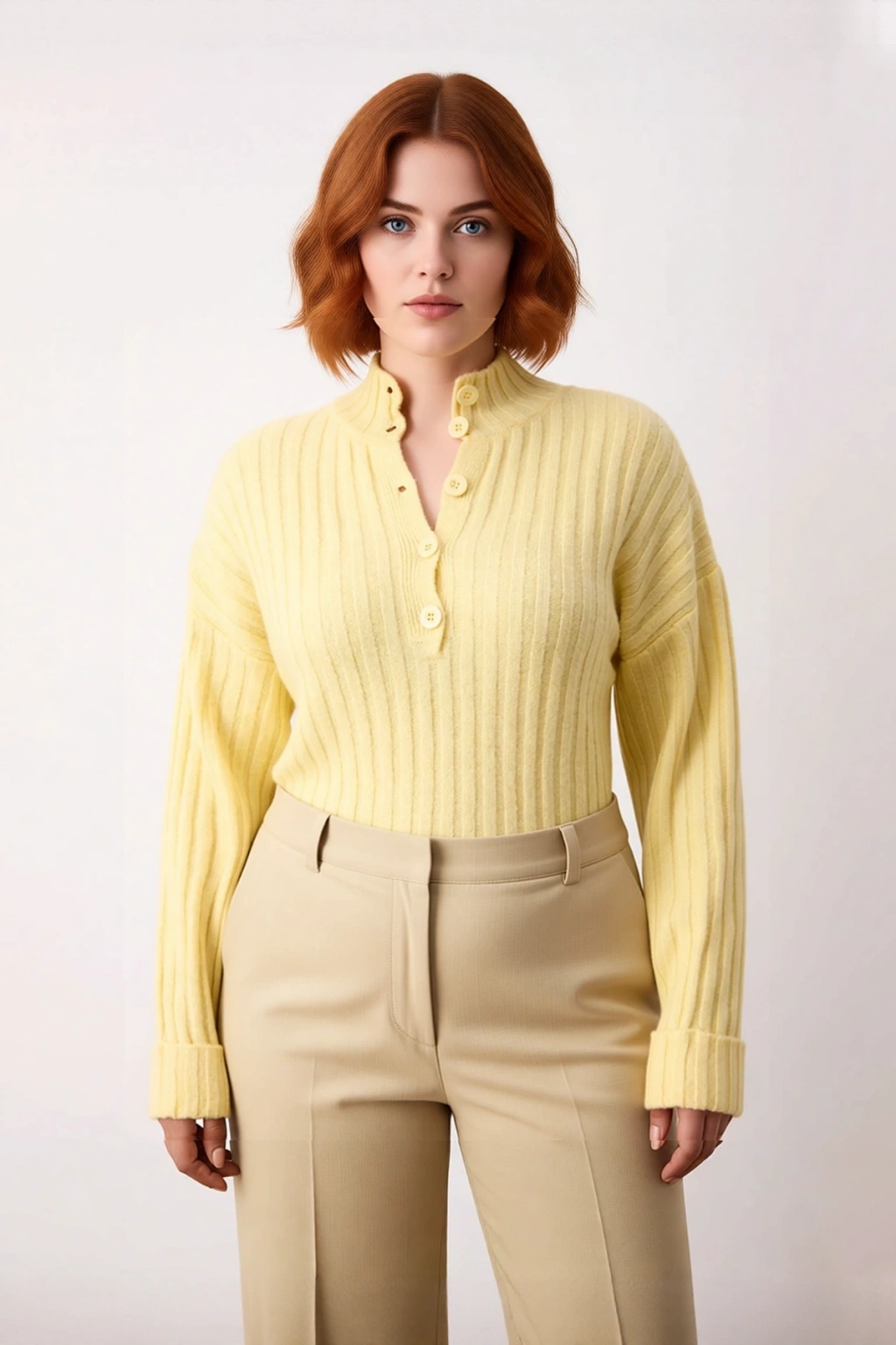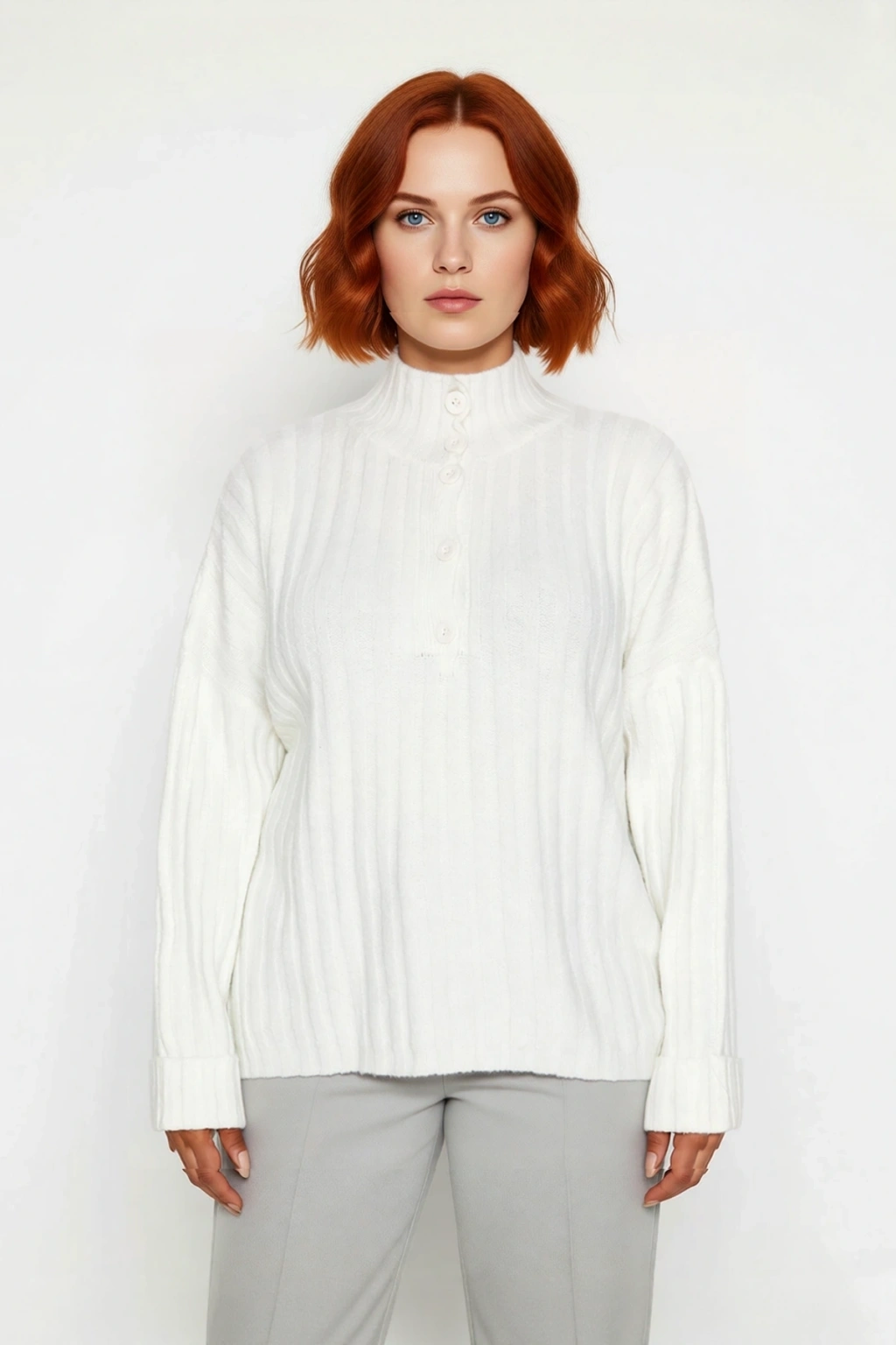 Kadınlar için tasarlanmış bu fitilli dokuma triko kazak, relaxed kalıbı sayesinde gün boyu süren eşsiz bir konfor vaat ediyor. Yumuşacık 80% akrilik ve 20% polyester karışımı materyali, soğuk kış günlerinde sizi sıcacık tutarken, cildinize nazik bir dokunuş sunar. Düz deseni, fitilli dokuma detaylarıyla zenginleşerek klasik bir zarafet sergiler. Ön kısımda yer alan şık düğmeler, kazağa modern ve özgün bir hava katarken, basic silüeti ile her türlü kombinize kolayca uyum sağlar.