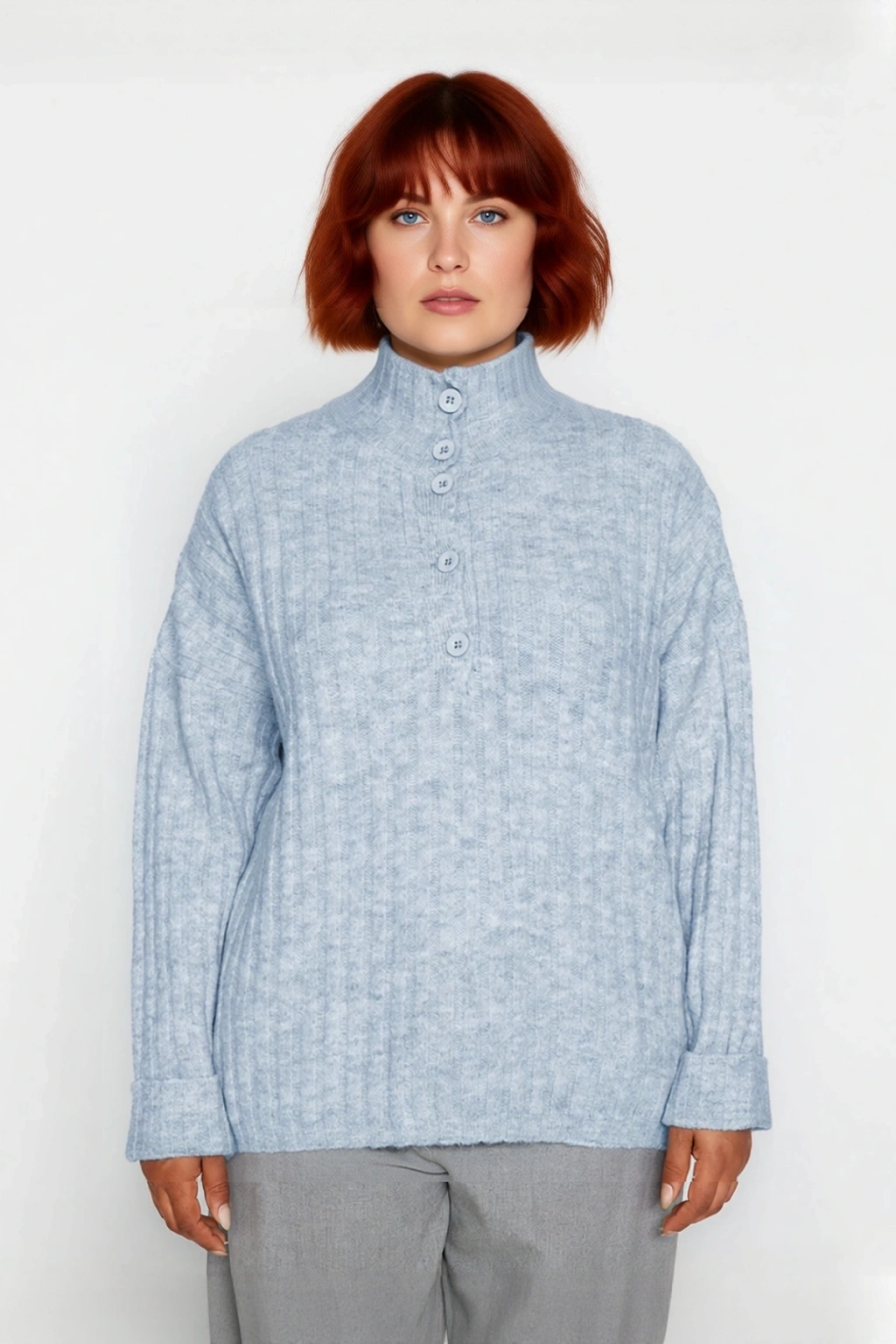 Ürün Özellikleri: Relaxed kalıp, 80% Akrilik 20% Polyester materyal, düz desen, dik yaka, standart kol, triko kumaş, turkuaz renk, düğmeli tasarım.