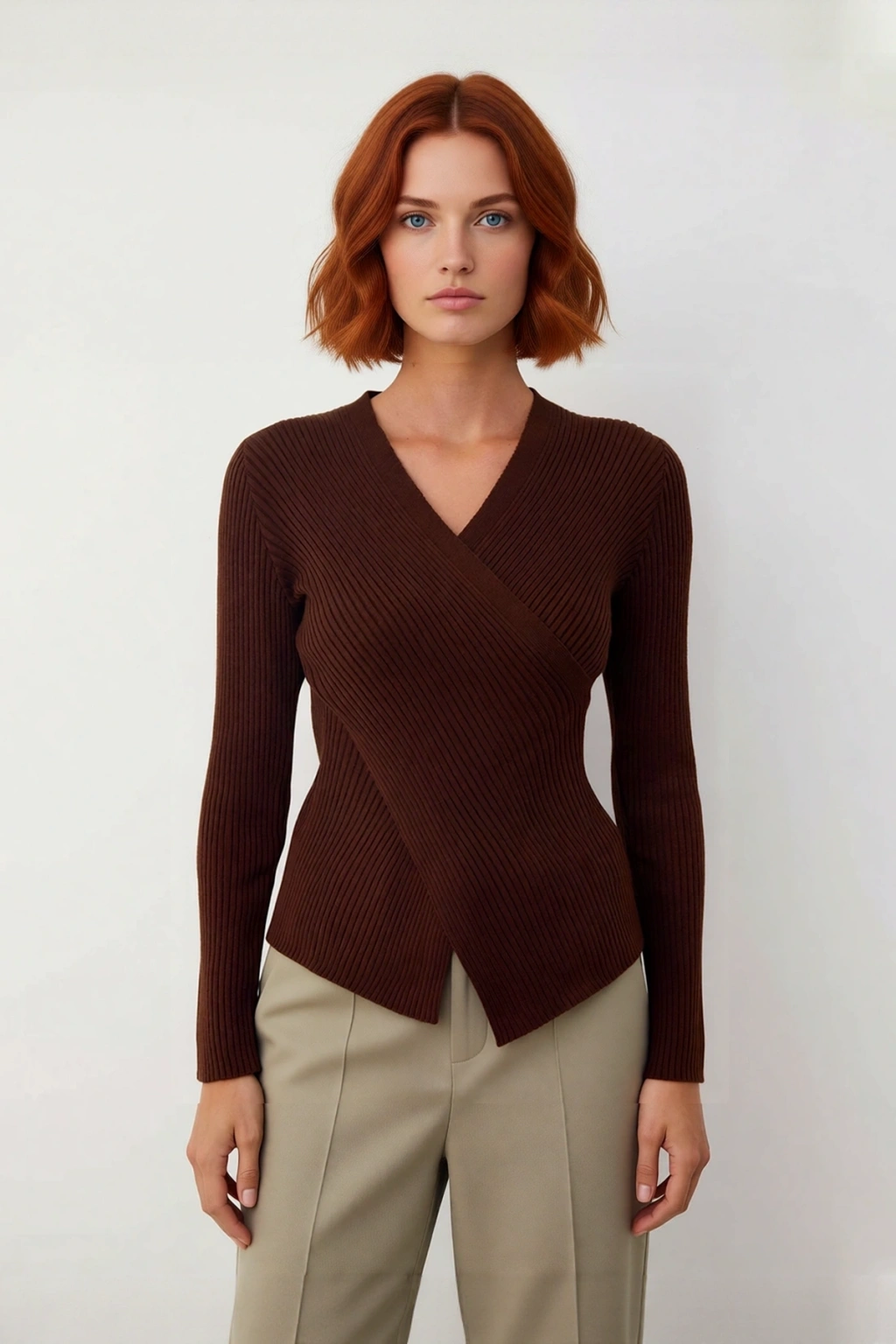 Ürün Özellikleri: Fitted kalıp, akrilik materyal, fitilli desen, kruvaze yaka, standart kol, triko kumaş, kahverengi renk.