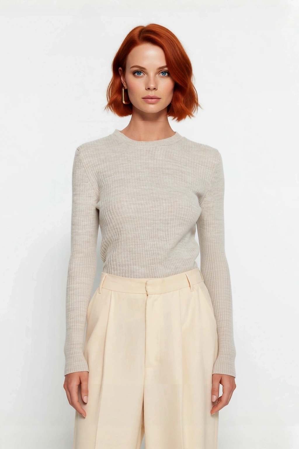Ürün Özellikleri: Fitted kalıp, %100 akrilik materyal, fitilli desen, bisiklet yaka, standart uzun kol, triko kumaş, bej renk.