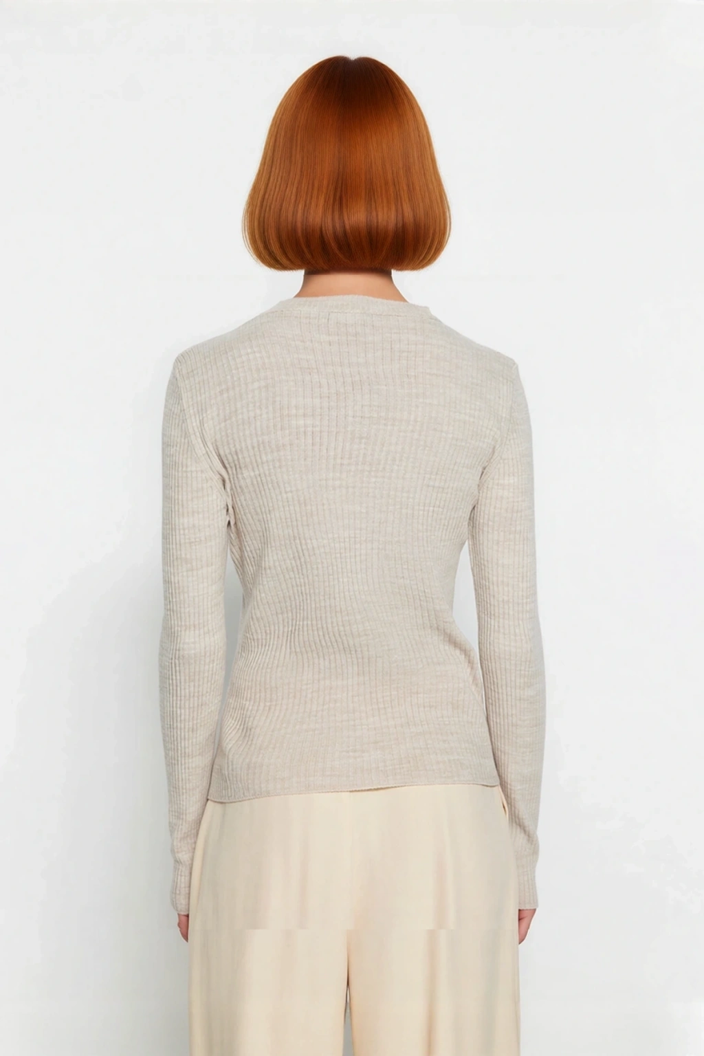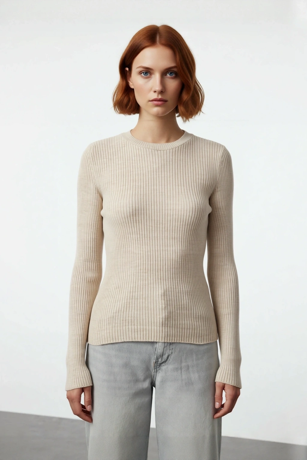 Ürün Özellikleri: Fitted kalıp, %100 akrilik materyal, fitilli desen, bisiklet yaka, standart uzun kol, triko kumaş, bej renk.