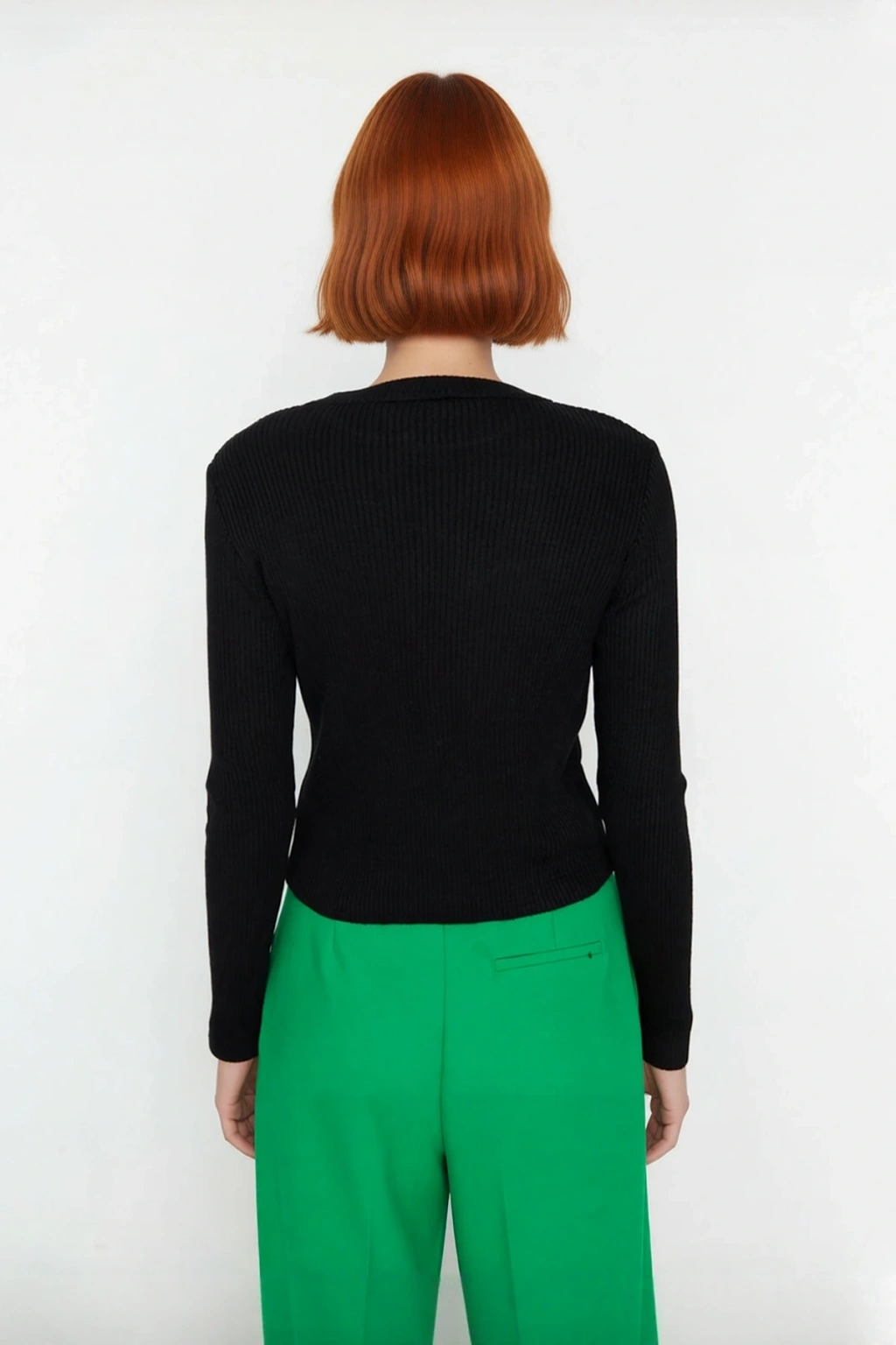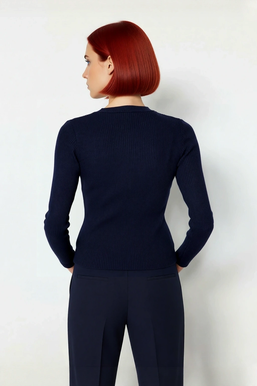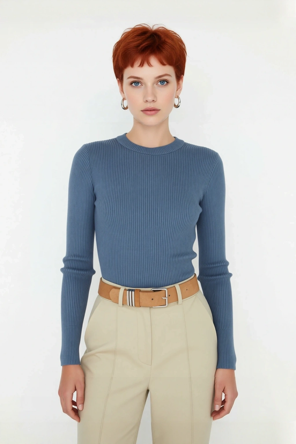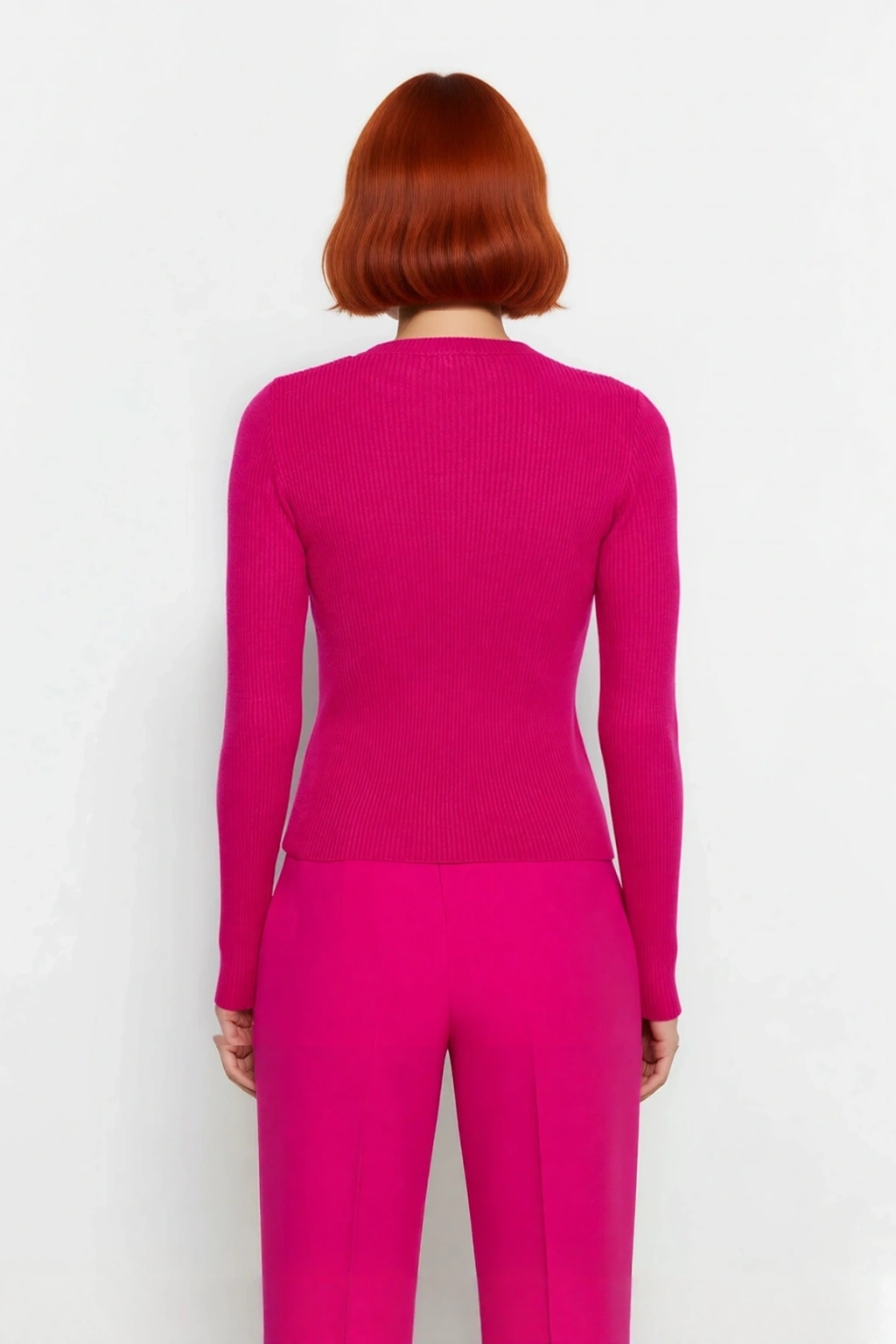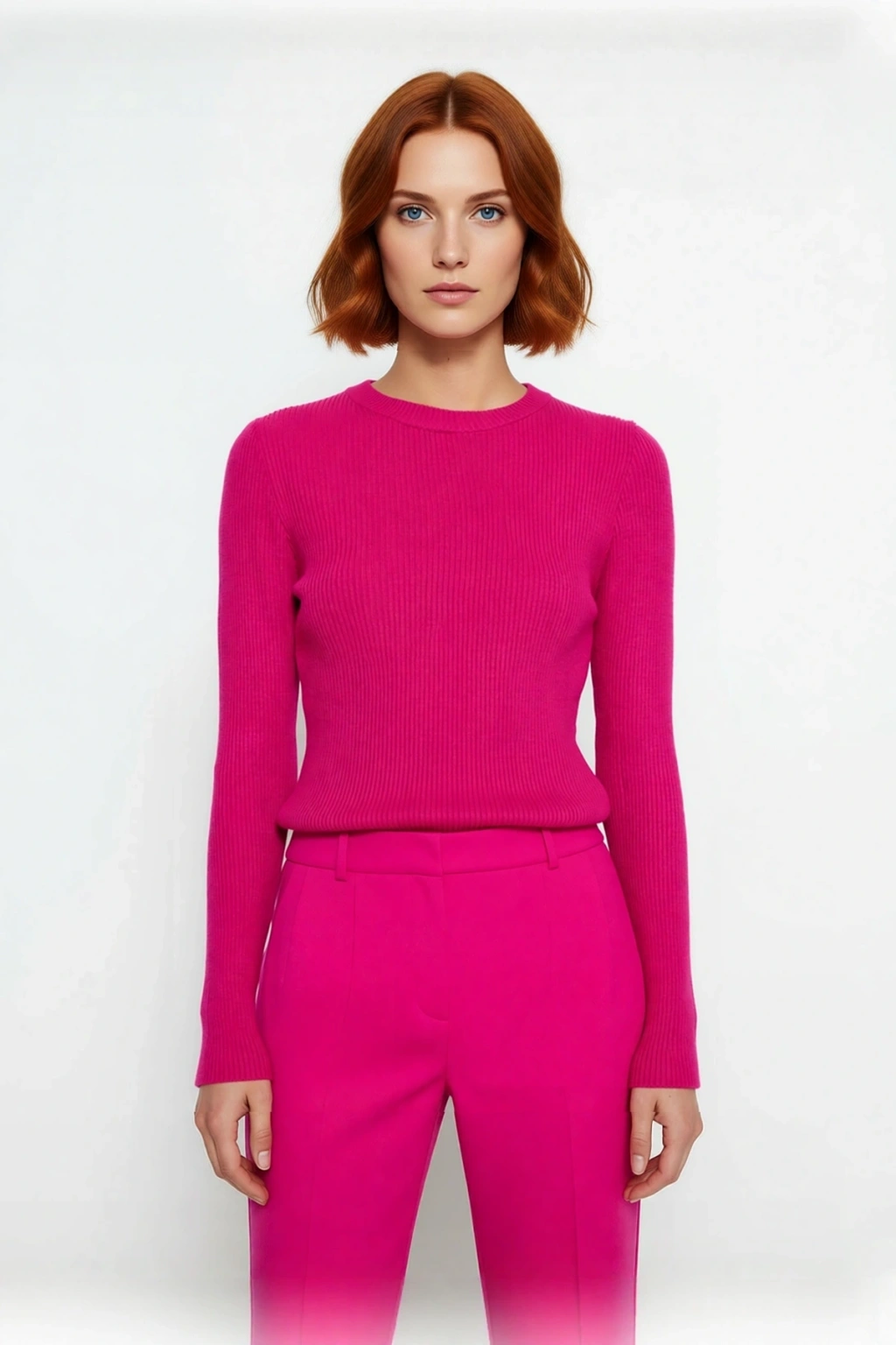 Ürün Özellikleri: Fitted kalıp, %100 akrilik materyal, düz desen, bisiklet yaka, standart uzun kol, triko kumaş, pembe renk, fitilli dokuma.