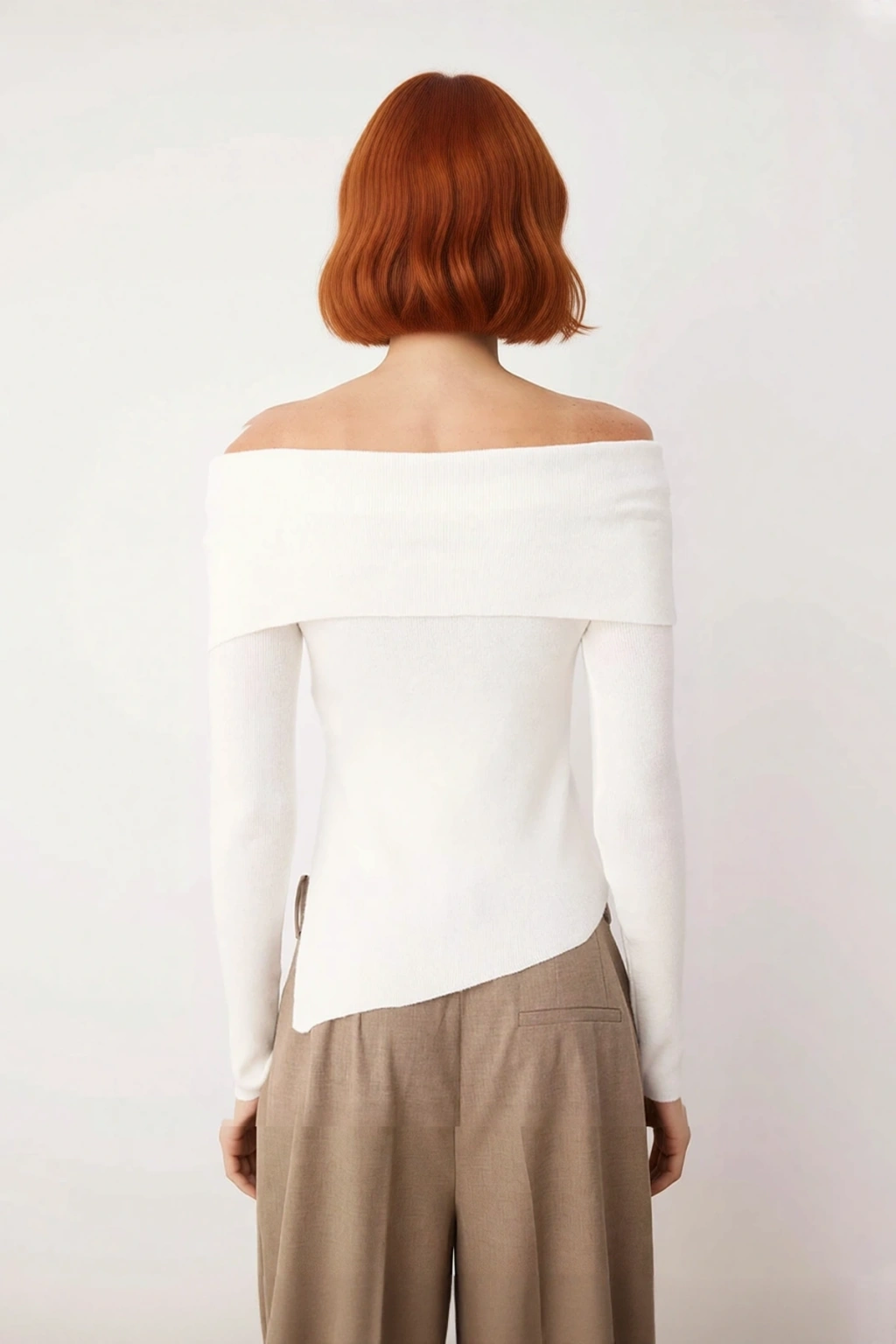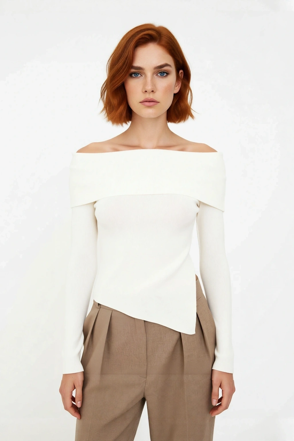 Ürün Özellikleri: Fitted kalıp, viskoz polyester poliamid materyal, düz desen, carmen yaka, standart kol, triko kumaş, ekru renk.