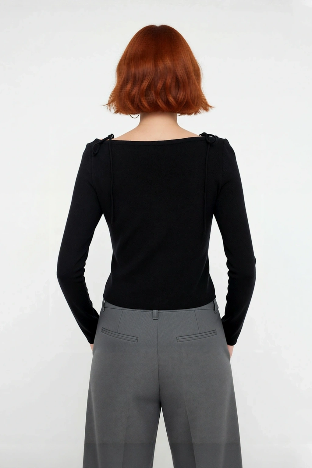 Ürün Özellikleri: Fitted kalıp, viskoz karışımlı materyal, düz desen, kayık yaka, düşük kol, triko kumaş, siyah renk, crop boy.