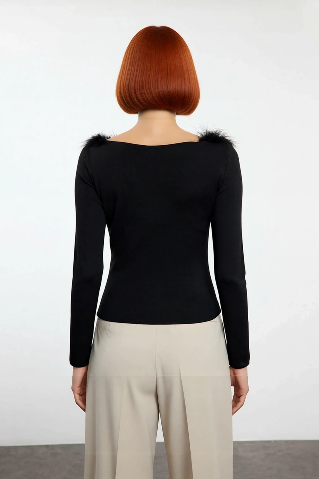 Bu dikkat çekici kadın triko kazak, kayık yaka üzerindeki tüylü detayıyla tarzınıza sofistike bir dokunuş katıyor. Fitted kalıbı vücudunuzu zarifçe sararak modern ve estetik bir siluet oluştururken, %100 polyester materyali sayesinde gün boyu yumuşaklık ve esneklik hissi verir. Düz siyah rengi, tüylü yaka detayının tüm ihtişamıyla parlamasını sağlar ve her kombininize kolayca adapte olur. İnce dokusu ve feminine çizgisiyle bu kazak, kış sezonunun vazgeçilmez parçalarından biri olmaya adaydır.