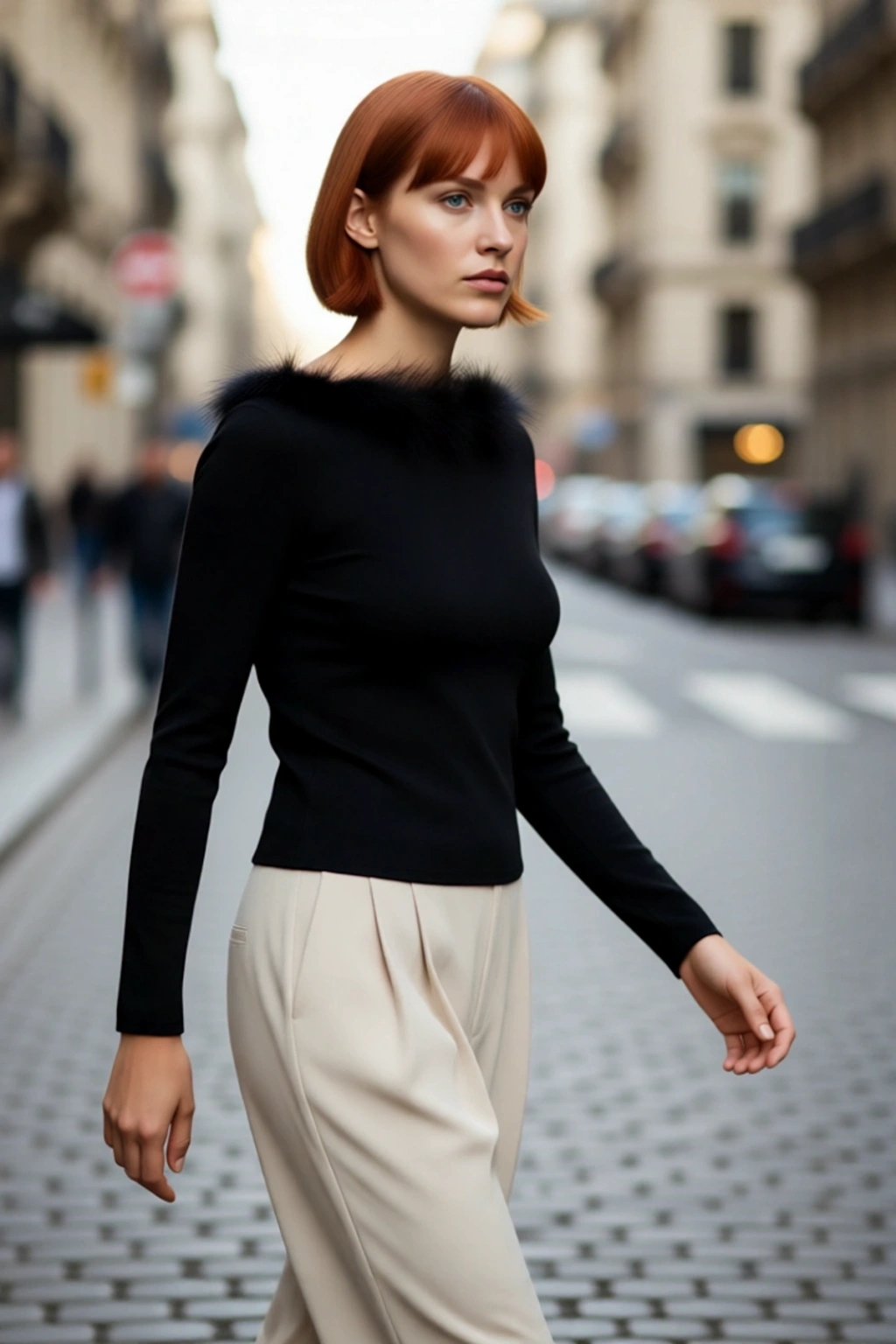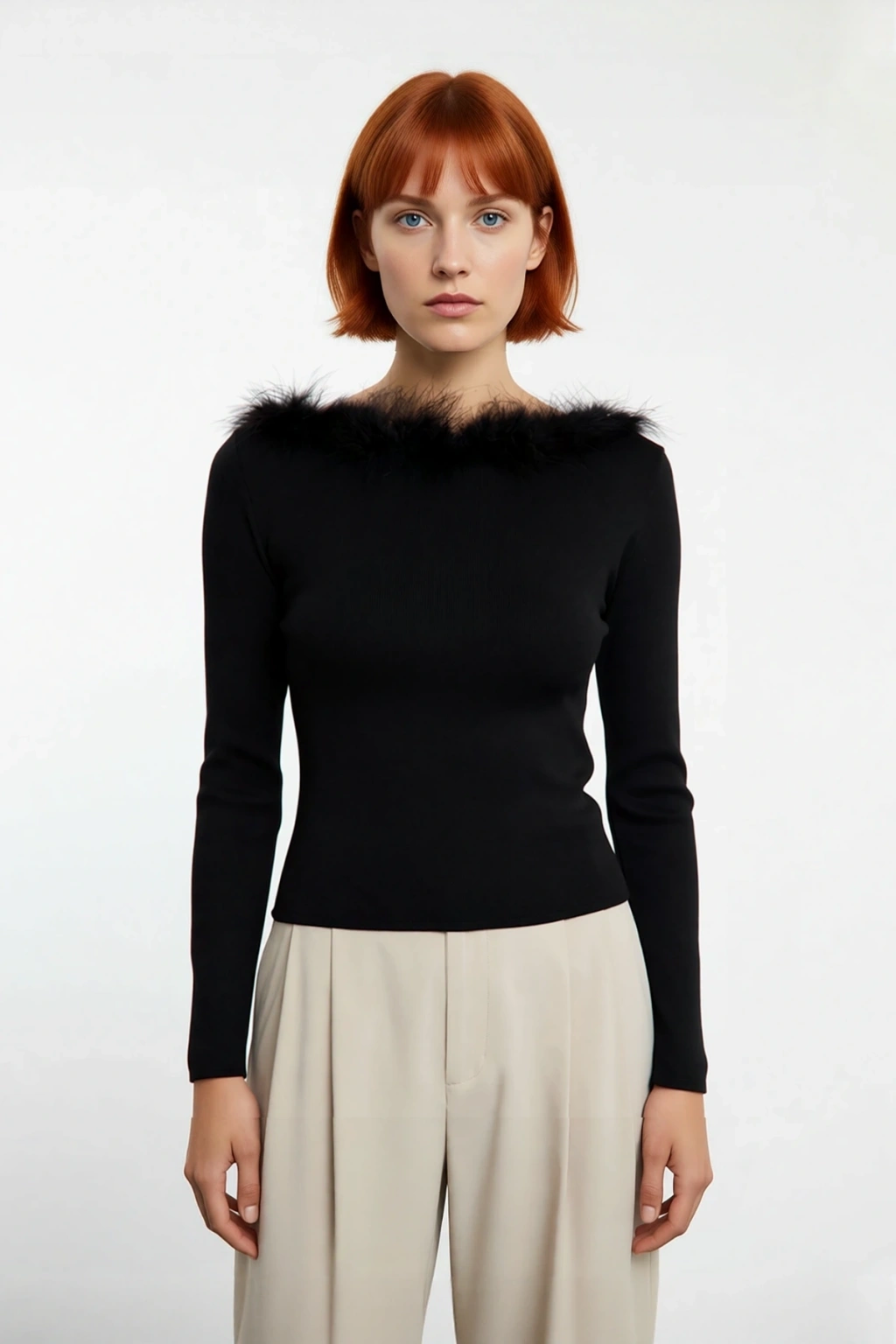 Bu kadın triko kazak, kayık yaka üzerindeki çarpıcı tüylü detayıyla her anınızda zarafeti yakalamanızı sağlar. Fitted kalıbı, vücudunuzla kusursuz bir uyum yakalarken, yüzde yüz polyester materyali cildinize yumuşak bir dokunuş sunar ve gün boyu rahatlık vaat eder. Düz siyah tasarımı, bu göz alıcı detayın ön plana çıkmasına olanak tanıyarak her kombine sofistike bir hava katar. İnce dokusuyla dikkat çeken bu parça, feminine bir görünüm sergilerken, şıklığınızdan ödün vermemenizi sağlar.