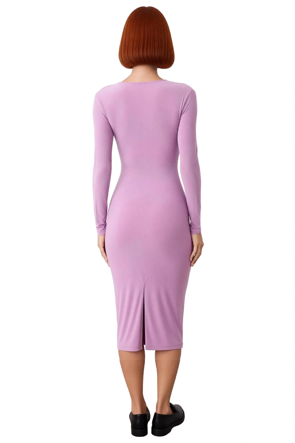 Ürün Özellikleri: Bodycon kalıp, polyester karışımlı materyal, düz desen, V yaka, standart kol, örme kumaş, leylak rengi.
