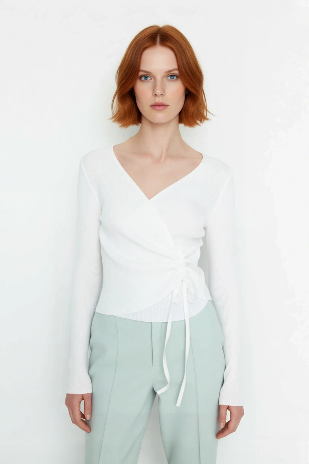 Ürün Özellikleri: Fitted kalıp, polyester materyal, düz desen, kruvaze yaka, standart kol, triko kumaş, gri renk, bağcıklı tasarım.
