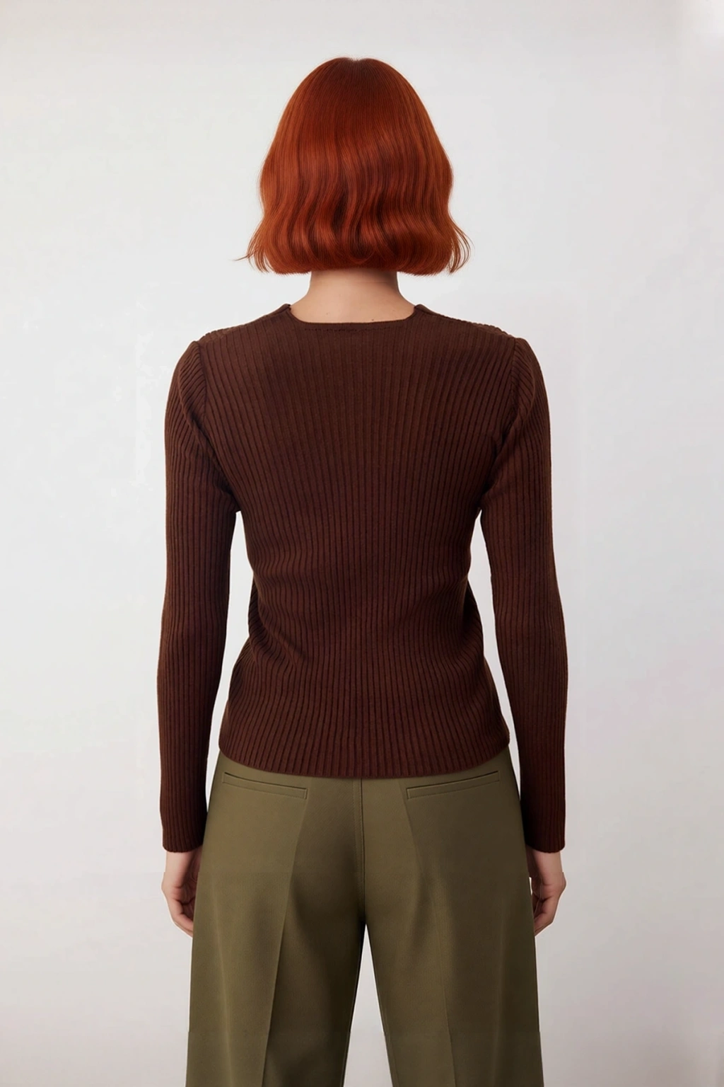 Ürün Özellikleri: Fitted kalıp, akrilik materyal, fitilli desen, kruvaze yaka, standart kol, triko kumaş, kahverengi renk.